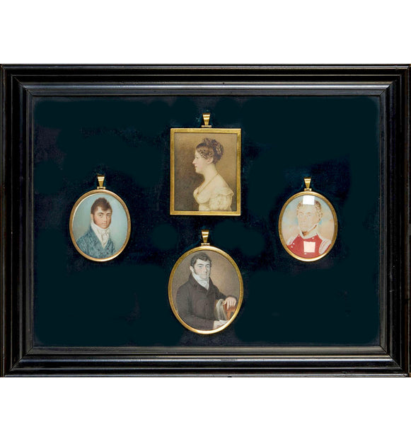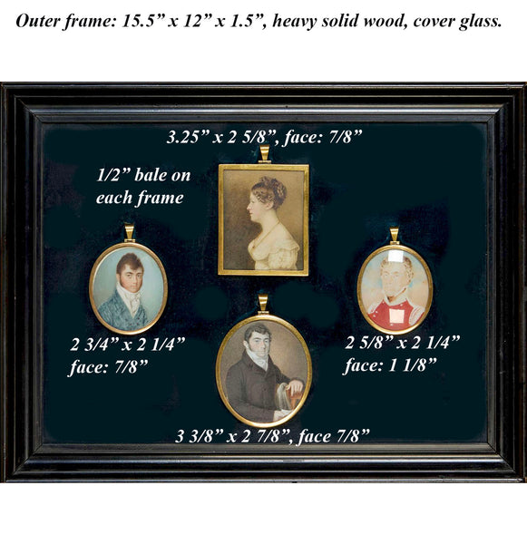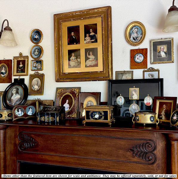 Very good to excellent condition for age and type, preserved carefully and with an eye to the historical value. One can see that the 3 siblings center and left have been painted by an exceptional portrait miniaturist. I have not taken this apart to open and see if any show artist's signature, however. The brother in red uniform, right, was painted some good time later and by another artist. Each one remarkably unscathed by time, no chips, hairlines, cracks, damage. Fabulous group and such interesting historic value!