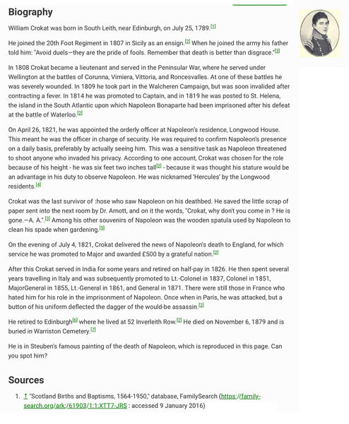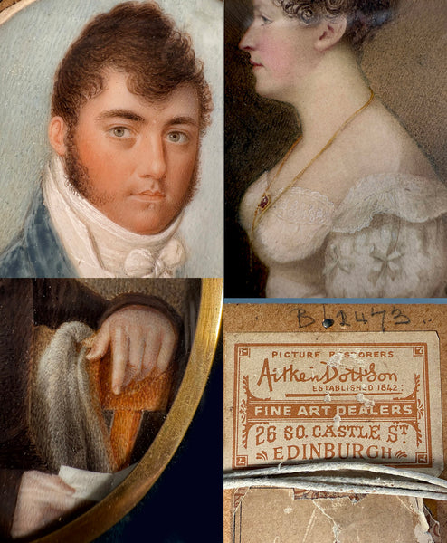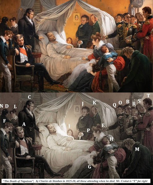 An interesting historical grouping of some brothers and a sister, family: Crokat, of Scotland, beautifully crafted in later 1700s, except the soldier in red which was painted early 1800s. The brother bottom center is painted before he fought Napoleon's armies, and well before he served as officer overseeing troops at Elba, guarding Napoleon. He was in attendance when Napoleon died, and is noted in history as having been there and also taken some small souvenirs as he departed the Island to report the event. Immortalized in a famous painting of the Death of Napoleon by Charles Stueben in 1825-30, an image of which I've included in our information. Also included is a history document. Each of these elegant portraits are of full value even without the important historic value, but should be most welcome to a Napoleon collector or museum. The 4 framed miniatures are mounted in fitted recess within a large frame, blue velvet backing each one. The outer heavy wood frame is black or nearly so. The family's handwritten IDs of each family member are attached on back, as shown. Spectacular grouping! Full measurements are noted on the photos.