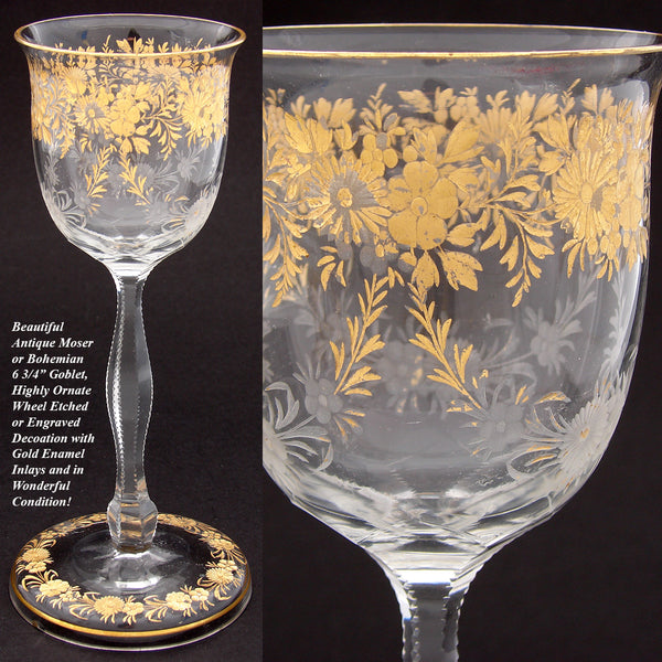 Beautiful antique Moser or Bohemian 6 3/4" goblet, wine or sherry glass with highly ornate wheel etched or intaglio engraved floral & foliate decoration and gold enamel inlays! Gorgeous! A single, yes, but why not spoil yourself? Beautifully done, look closely at the enlarged images and you'll also see the stem has cut accenting along the points of the hexagonal shape. Everything will taste better coming from this one :).