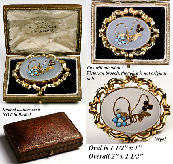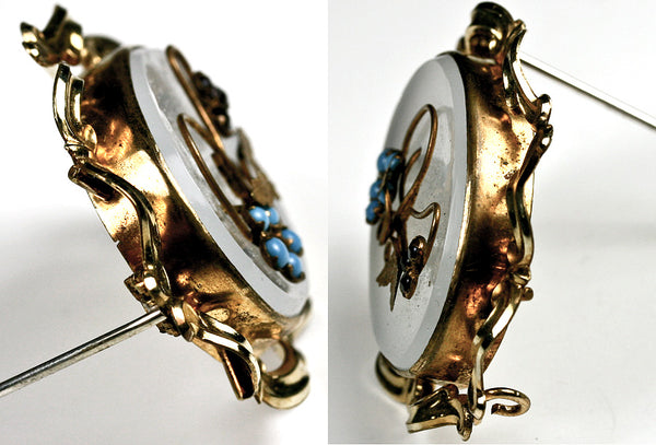 Very good to excellent condition for age and type. No chips to rim or main chalcedony stone and no losses to gems or gold. Pinback in good form. Box is not included.