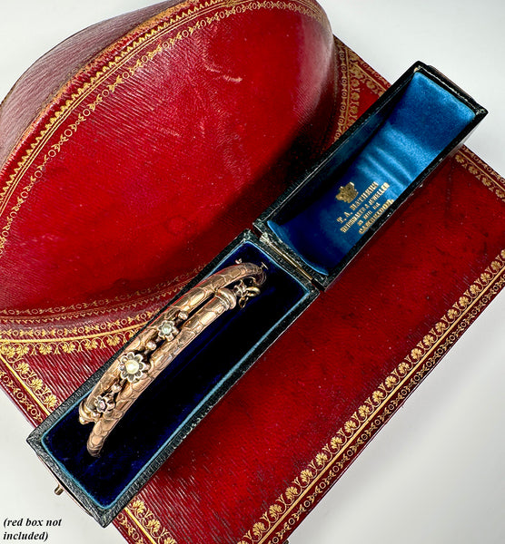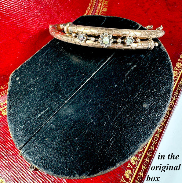 Very pretty Victorian era hinged bangle bracelet in .925 marked silver (sterling) with heavy gold layer (vermeil). Comes in original bracelet box, as shown, which is in very nice condition for age. I believe the guard chain might be a later addition but it, too, is marked .925 (sterling silver) and is gold plated. The bracelet easily fits my 6.25" wrist and would fit larger. I'll have to get interior measurement and add.