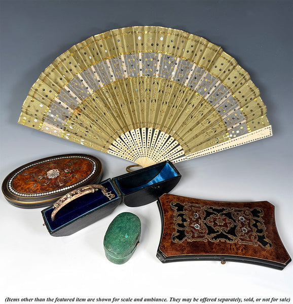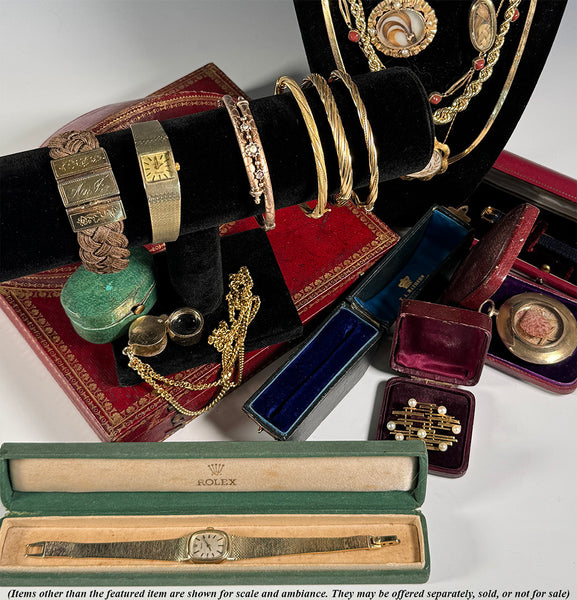 Very good condition for age and type. Shown here after polishing/cleaning the gold finish, I can't tell what karat it is but it does tarnish a little if left long enough. It shows so pretty in the bracelet box which is, itself, a fine antique.