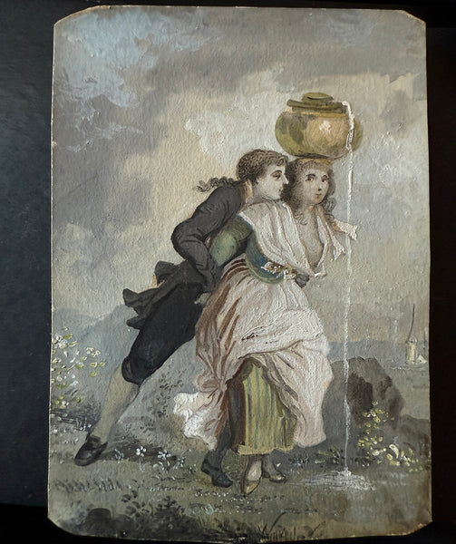 Painting in gouache on paper, after an original by Romantic Era (c.1700s) French artist, Fragonard. So often the Romantics deal with subjects of seductions, of losing virginity (as the icons in this one present - spilled milk or a broken jug). Beautifully painted and in excellent condition. The faces are a tiny 1/4" from chin to hairline. Beautiful palette, all gray-pastels, hints of color. The frame is superb, as well! Sphinx and classical motifs in cast bronze. The artist has signed on back, Vielar. Full measurements noted on photos.