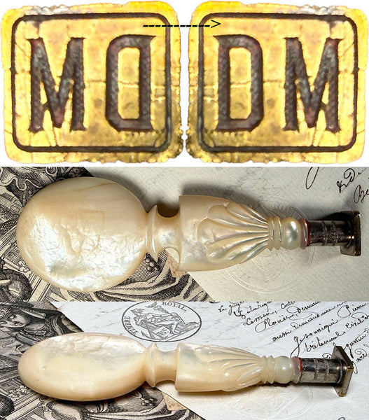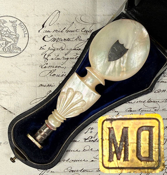 From my own lifelong collections: Silver shield cartouche and stunning hand carved mother of pearl handle, surely from a large vanity travel or desk necessaire dating early 19th century to perhaps last half 18th century. Steel shaft with brass or bronze matrix which has D M Monogram. Crafted in the late 1700s popular 'balon' or 'balloon' form, I've read the form hails to the first hot air balloon flight, "The first 'aerostatic' flight in history was an experiment carried out by the Montgolfier brothers at Versailles in 1783", but I am not positive. Thick, solid, stunningly beautiful pearl, full measurements are noted on our photos.
