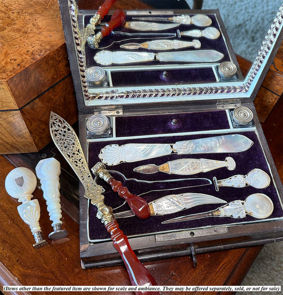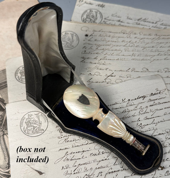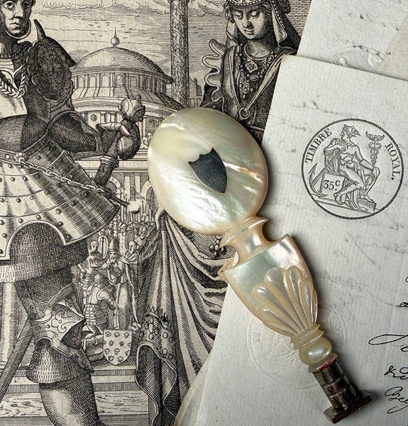 Very good to excellent condition for age and type, not a single chip nor any damage to this elegant carved mother of pearl. Just a mention that I feel slightly uncertain about the matrix on this one. It's my experience if a matrix is engraved, so would usually be the silver shield cartouche in the same initials and I have wondered if it might be a replacement. I've had a few 18th century writer's nécessaire or sets with this form seals original to them, so I'm not unsure of age. Box is not included, as noted. In final photos you'll see other of my own collection of important wax seals, all of which are to be sold separately. Look for those, too.