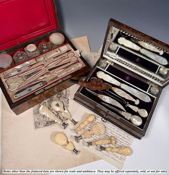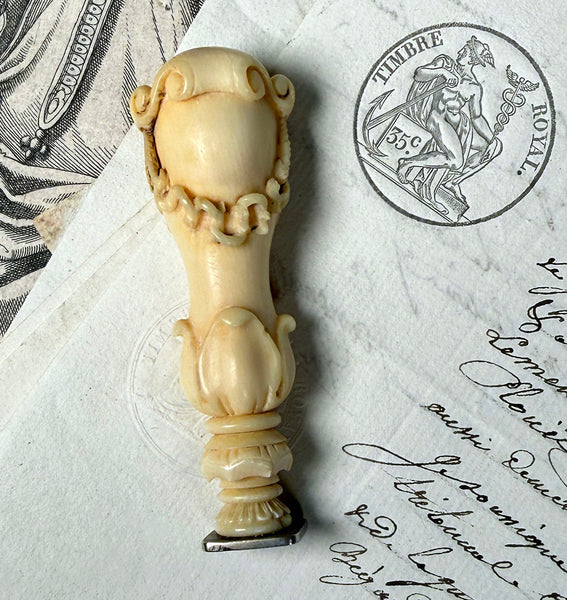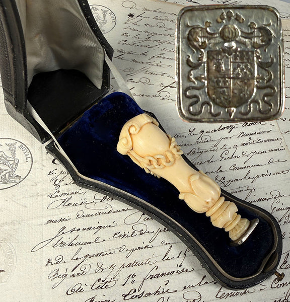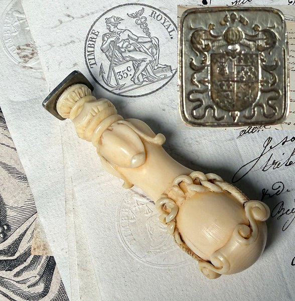 From my own lifetime collections, a rare beauty, this 18th century to early 19th century armorial crest as monogram on the matrix, combined with an ornate form in Dieppe hand carved ivory handle. More and more collectors searching out these armorial crest sceau, and here it was in a crate of my own longtime collections, comparable I'm finding now have sold well above 1500 GBP, some now priced above 2500 GBP, roughly $3800, US, which sort of amazes me. I digress. Full measurements noted in the photos. Final images show it alongside others of my collection which are also going up for sale now, all sold separately**.