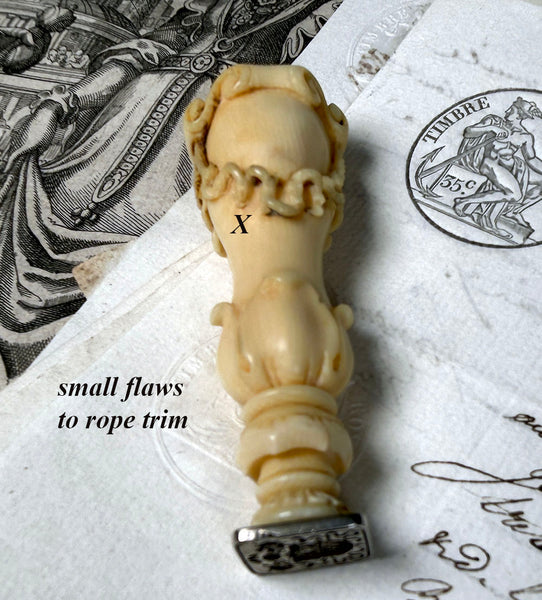 Very good to excellent condition for age and type. There are small almost unnoticed (in hand) chips to the tiny rope twists that drape from the top, visible here greatly enlarged for your inspection. I don't see the typical very fine aging line from shrinkage of the natural material, and I sincerely apologize for these greatly enlarged photos showing a little dirt in the recesses. I thought I had it cleaned better. A rectangular matrix with attractive rounded corners, and splendidly engraved armorial crest I have not researched. The matrix is clean and is crafted in steel.