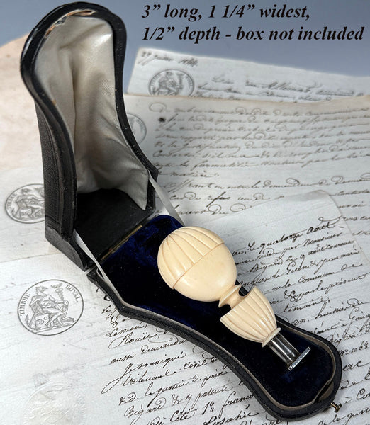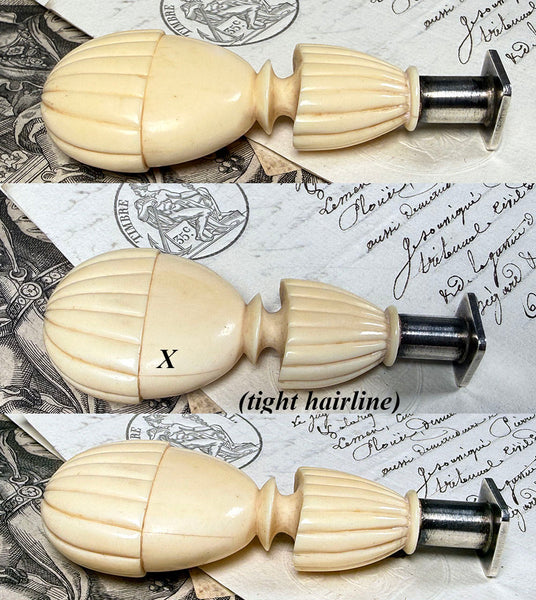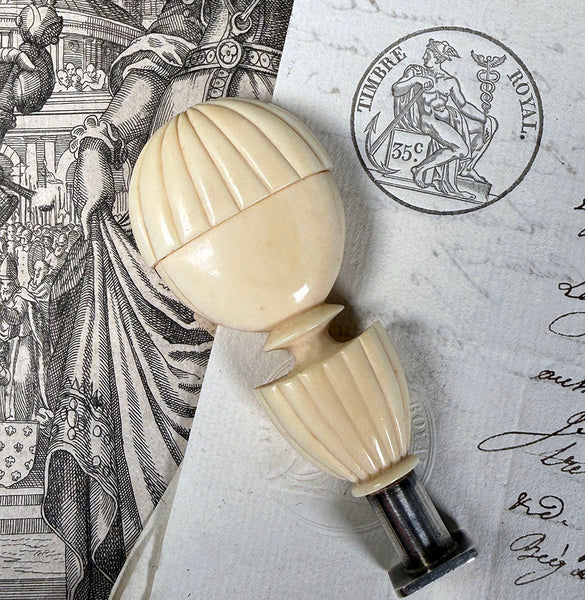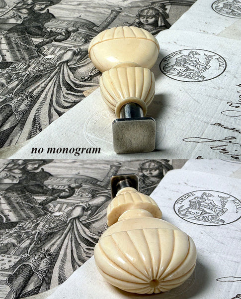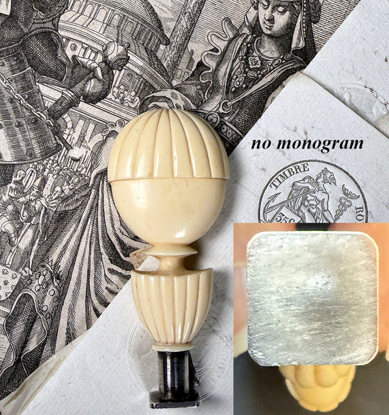 From my own lifetime collections, a rare beauty, this 18th century to earliest 19th century seal with French steel, perhaps a silver coating but no marks on the matrix, ready and awaiting your own to be engraved or mounted. A superb 'balloon' or 'balon' form hand carved ivory handle, large and heavy in hand. One might think it commemorative or souvenir of The first 'aerostatic' (hot air balloon) flight in history which was an experiment carried out by the Montgolfier brothers at Versailles in 1783, but we do find the form even earlier. RARE, as noted, and from my own longtime collection, comparable I'm finding have sold well above 2000 GBP, some now priced above 3000, roughly $4500, US, and none of those bear the open matrix. Full measurements noted in the photos. Final images show it alongside others of my collection which are also going up for sale now, all sold separately**.