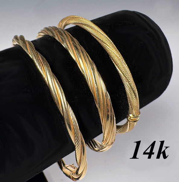 These are my own, gifted to me in 1880 and almost never worn. Each one is in excellent condition for vintage jewelry and have safety latch closure. Perfect for today's fashion of stacking bracelets. You are buying all 3 together, and the total weight is 22.61 grams, 14k gold. Melt value today is just at $1700, store value much much higher for these beautifully worked twist-form beauties. A great value at our price since they're really like brand new.