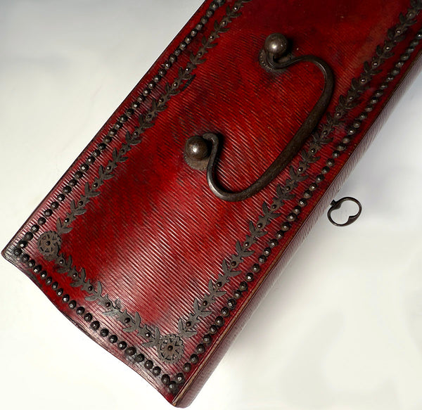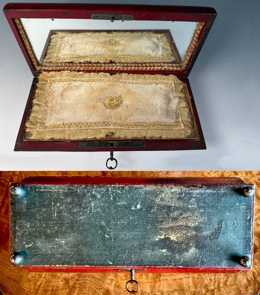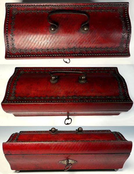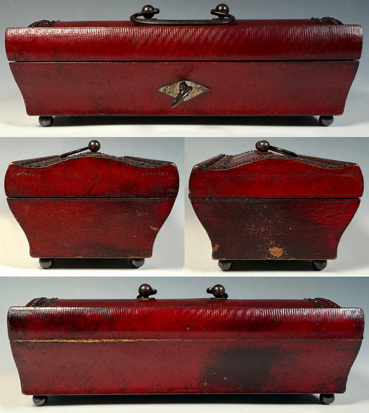 Rare to find, very nicely preserved Napoleonic era sewing box, mother of pearl sewing tools all inside but the bodkin (needle), and a gold-capped perfume bottle, as well. The red cordovan leather-clad wood box is in sarcophagus form, and trimmed out in cut steel which is entirely intact. Hinged handle is, also, and the same for working lock and original key. A surprise when opened, the old original mirror is unbroken, and the hand-sewn silk pad is also intact and nicely preserved with its unique ruffled edge. A lift-out tray reveals the silk lined compartment beneath to be clean and without deterioration. And the tools! As you can see, there are scissors, needle case, thimble, 2 original silk winder snowflakes, the stiletto and a perfume bottle that still has its stopper. A pin cushion and fitted interior over 200 years old remains beautiful for display! Full measurements noted on the photos.