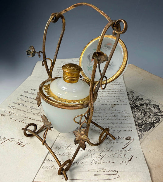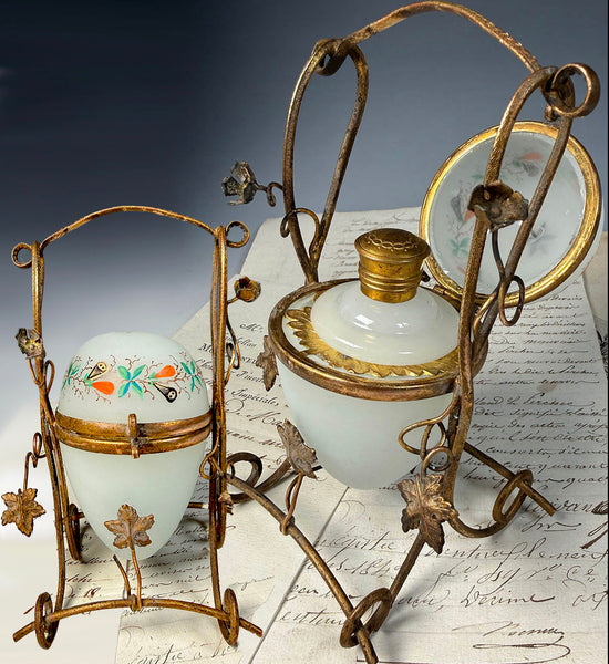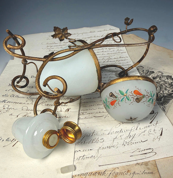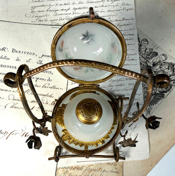 Very good to excellent condition for age and type. Not a bit of flaw or problem noted in any of the opaline glass, no chips, no hairlines or imperfections. The scent flask still has its original matching stopper, which is surprising. The hand painted decoration is also remarkably complete, no loss. Hinge and clasp working well, and there are no breaks to the ormolu framework. Sound and rests evenly. I was tempted to put a glass bead into the ormolu flowers, since they appear to have once had same (and from experience, I know they sometimes did), but I'll leave the decision to the next owner.