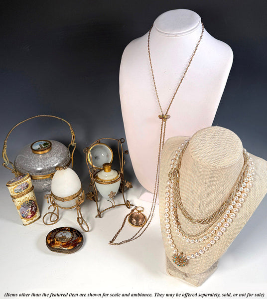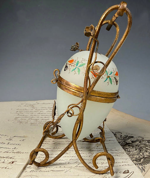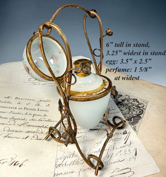 Dating to about Napoleon III at latest, likely a bit earlier (c.1840-50s) survives this charming French opaline glass trinket, likely from the boutiques of the Palais Royal, the old palace of Cardinal Richelieu (such history!). The boutiques were full of finest quality fares from fine clothing to weaponry, elegant silver and travel cases fitted out with every possible traveler's necessity (Nécessaire), and the famed sewing boxes, and whimsical trinkets and gifts like this one. Sometimes these 'eggs' were empty, to fill with bonbons. Some were fitted inside with a complete sewing implements set, and some had scent or perfume bottles inside like this one. Fun to collect then and now! Full measurements are noted on our photos.
