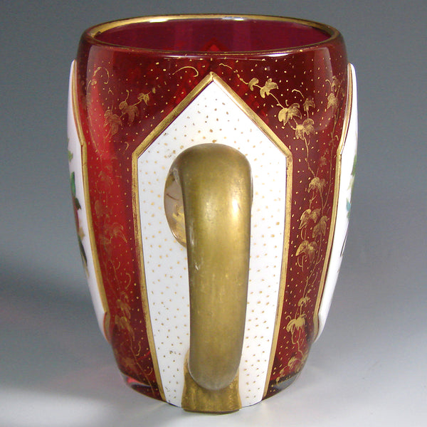 Antique Victorian Era Bohemian Moser Style Ruby Glass Cup or Mug, HP Enamel & Wheel Cut Cabochons