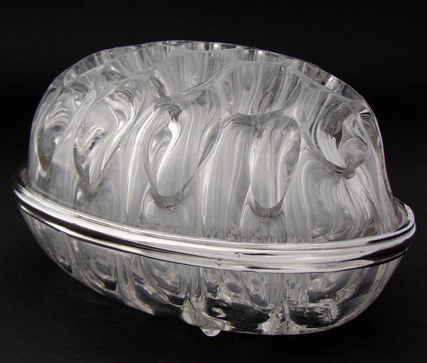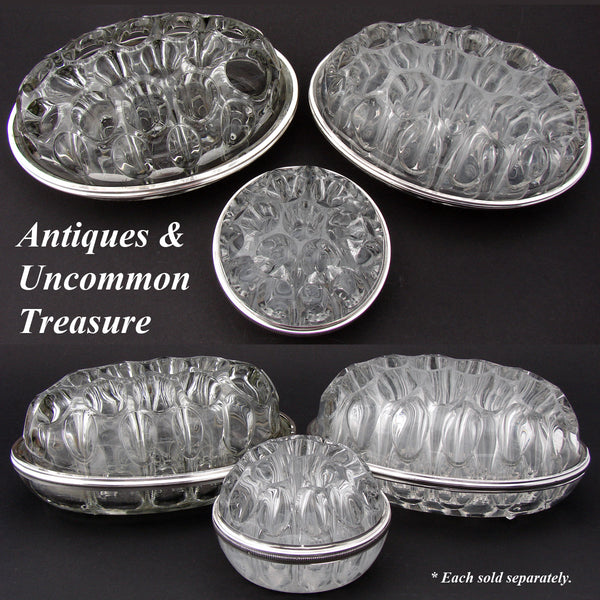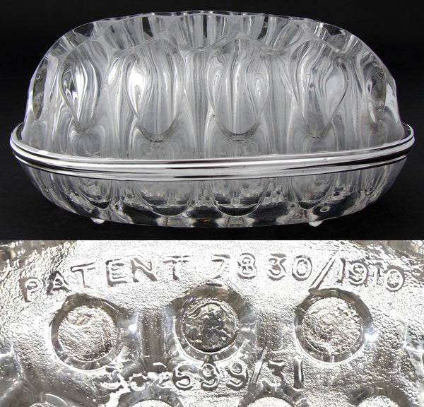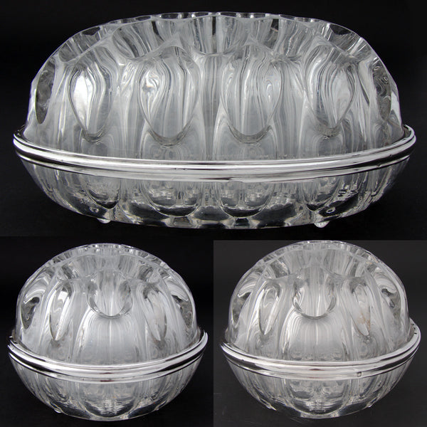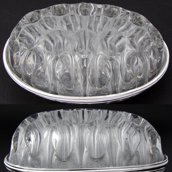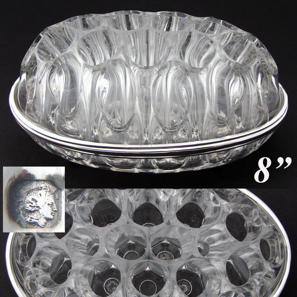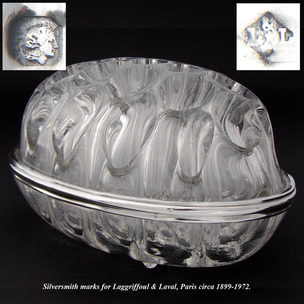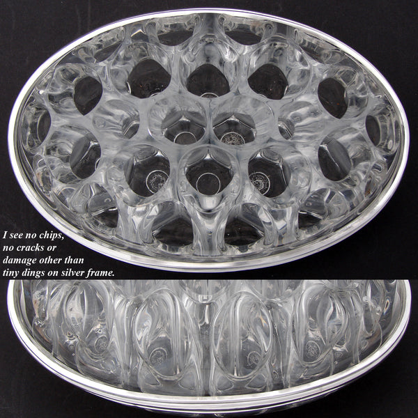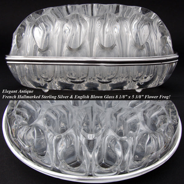 Gorgeous vintage French hallmarked sterling silver & blown glass 8 1/8" x 5 3/8" flower frog, vase or centerpiece, large, heavy & beautiful! We have a few of these and I'll be getting the others listed in the next week or so surely. Wonderful decorative accents, just add flowers and the display is superb! The sterling band bears the French Minerve or Minerva hallmark, the tiny number "1" within that mark means it's in .950 silver (95% pure and higher than the .925 standard for "sterling" silver). The silversmith mark is for Laggriffoul & Laval, Paris circa 1899-1972 (quite a long time judging from my experience with Parisian silversmiths. The base of the glass insert is marked "Made in England" so a company in one country collaborated or ordered the complimenting part from the other. Lovely, don't miss it!