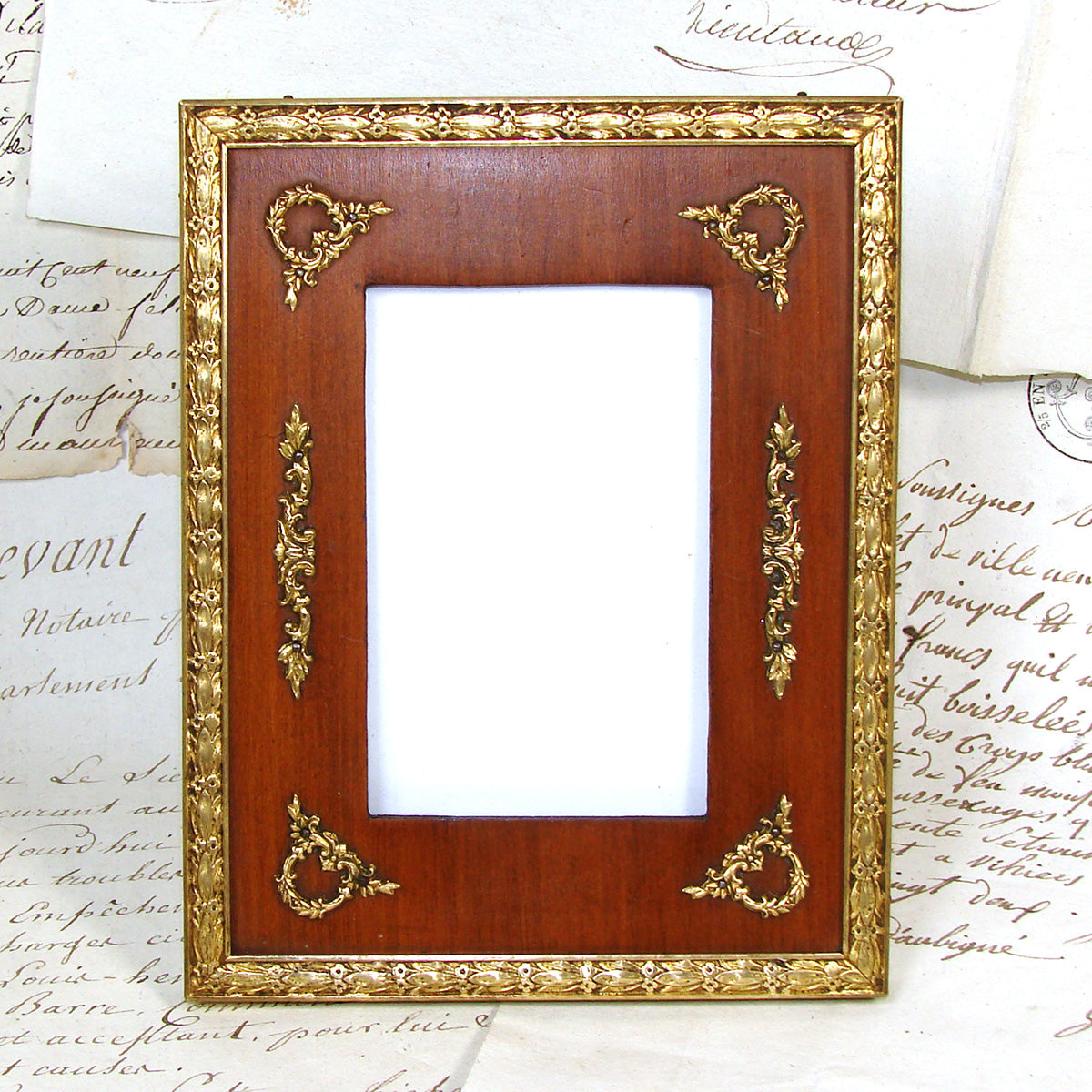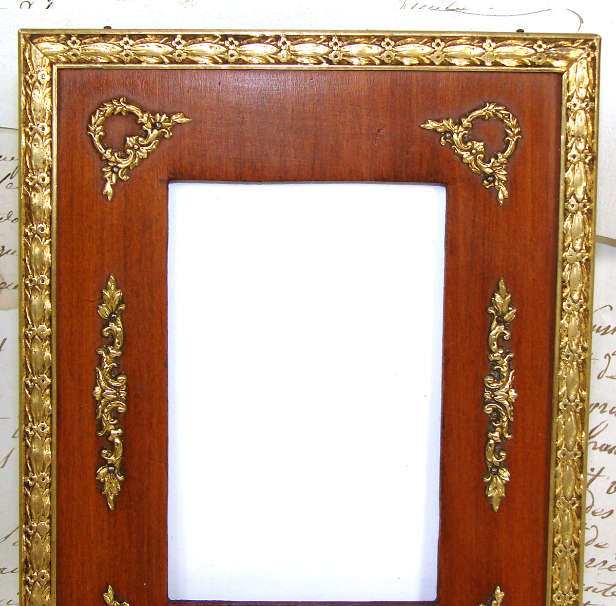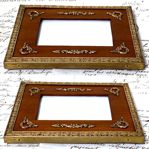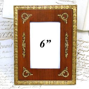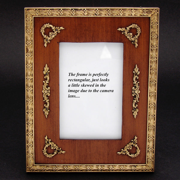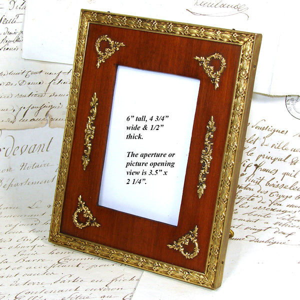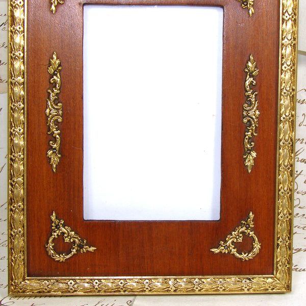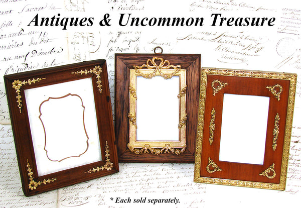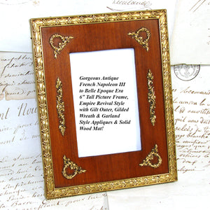 Gorgeous antique French Napoleon III to Belle Epoque (Victorian to Edwardian) Era 6" tall picture frame, Empire Revival style with gilt ormolu or bronze outer, gilded wreath & garland appliqués & solid wood mat!  A beautiful older piece and just one of several fabulous antique picture frames that we're adding today and in the week to come.  Be sure to browse some while you're with us, we're sure to tempt and there's nothing like antiques when scratching your decorative itch :) and nothing like elegant antique picture frames to display your treasured memories.