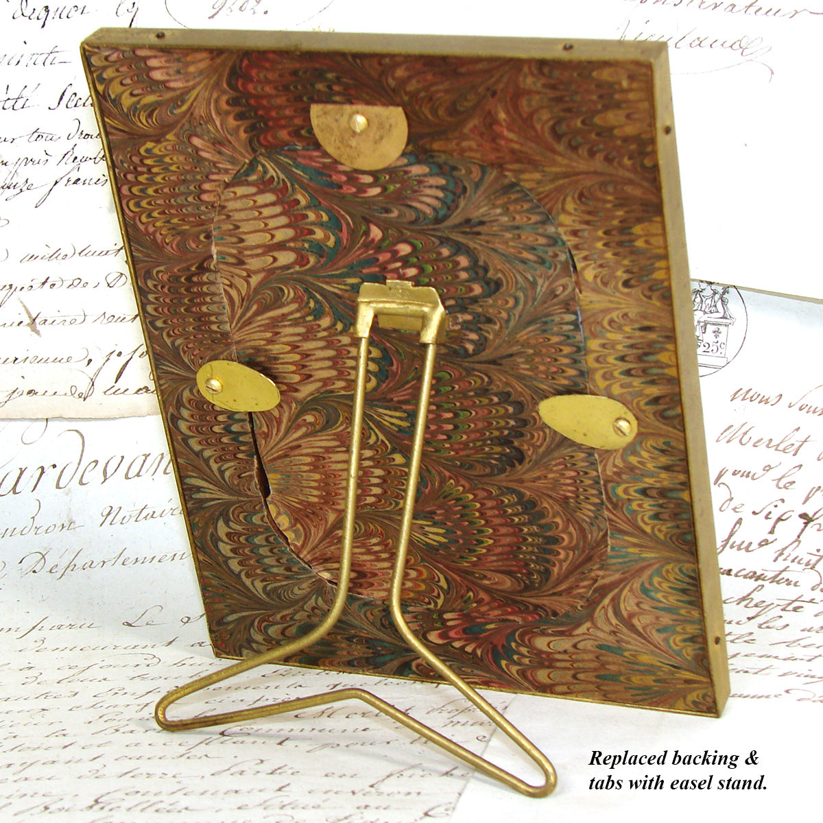 Very good condition, materials and age considered.  As visible in the images, there is some wear/age to the gilt portions, no chips or damage to the wood mat.  We did replace the inner backing with easel stand, salvaged from another antique frame (though not quite as old as this one) and we added the oil paper back covering & brass tabs.  See images for all measurements.