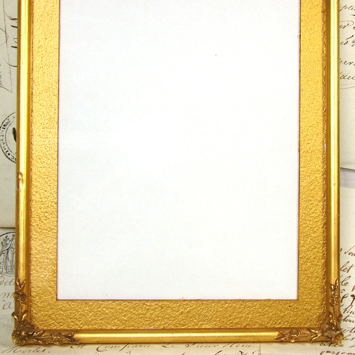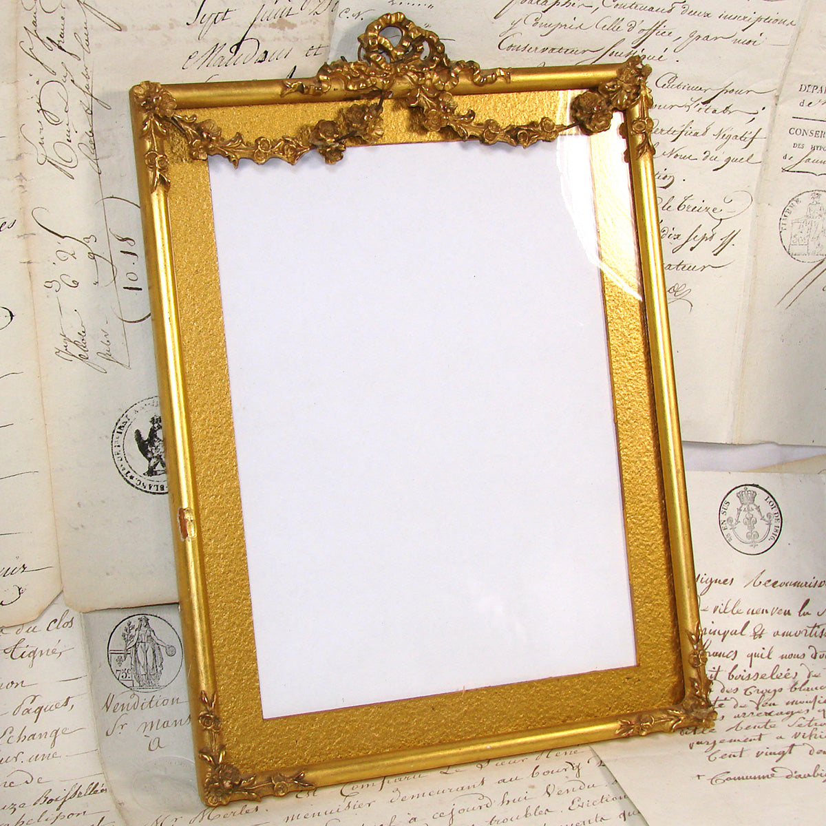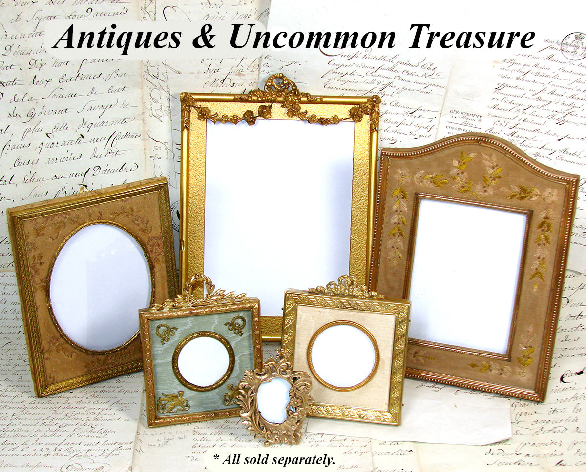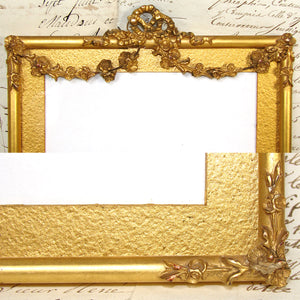 Lovely antique Napoleon III or Victorian era gilt gesso & wood 10 1/4" tall picture frame, "lemon gilt" with ornate bow & ribbon finial & floral garland gesso on wire draping from center to sides!  Some age damage or loss to this one but still a gorgeous wall hanging picture frame.  Virtually dripping gold, it has what appears to be the original gold paper/card mat and the card backing also appears original.  A beautiful older piece and just one of several fabulous antique picture frames that we're adding today and in the week to come.  Be sure to browse some while you're with us, we're sure to tempt and there's nothing like antiques when scratching your decorative itch :) and nothing like elegant antique picture frames to display your treasured memories.