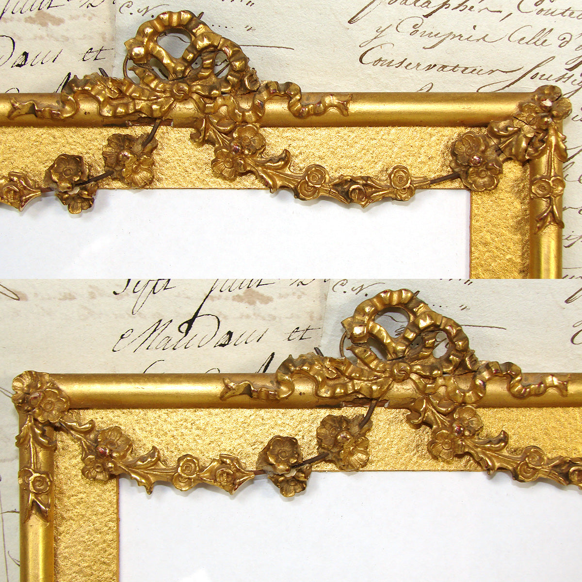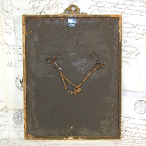 Very good condition, materials and age considered.  As noted and visible in the images, there is some loss to the gesso along the draped garland and bow/ribbon top.  Those are glided gesso affixed to wire and some loss is evident.  The gold mat is likely original and I'd keep it but we provided inner measurements if you want to show a slightly larger picture without the mat.  See images for all measurements.