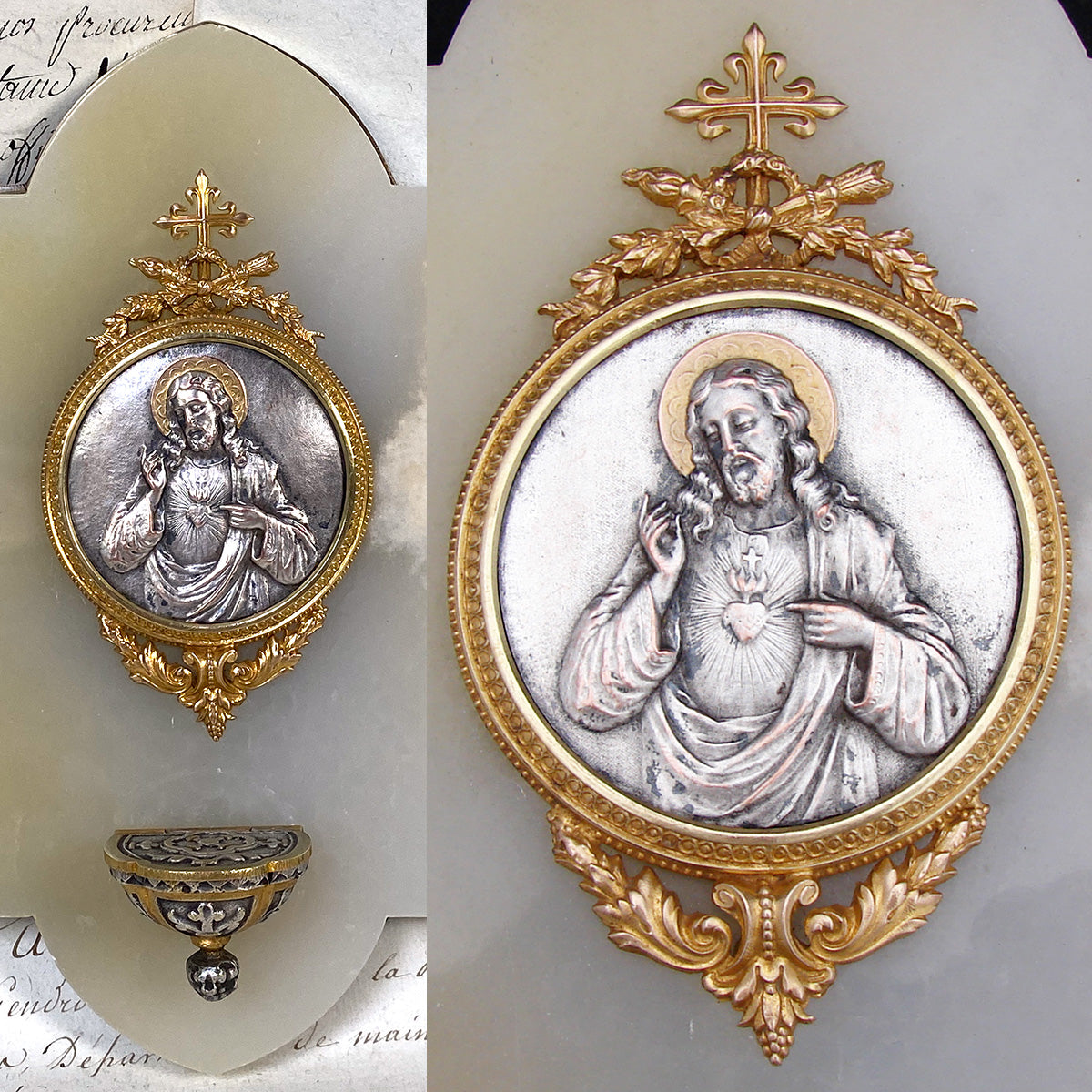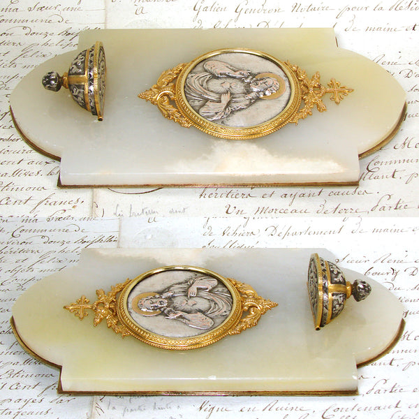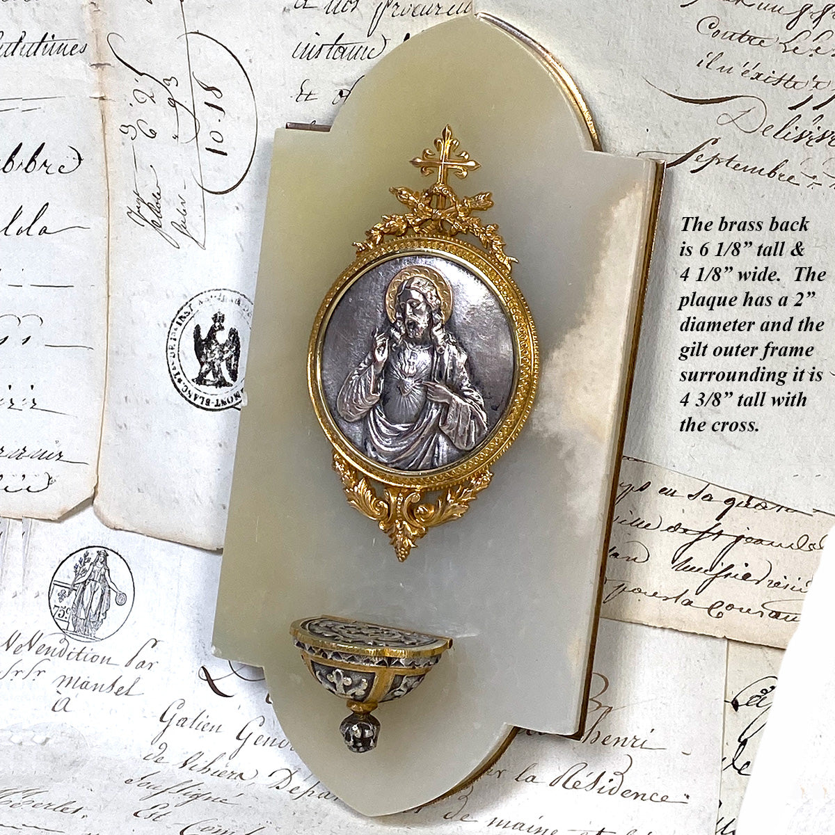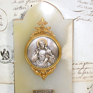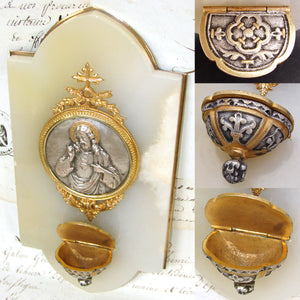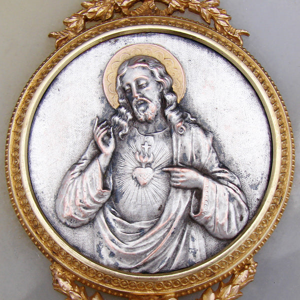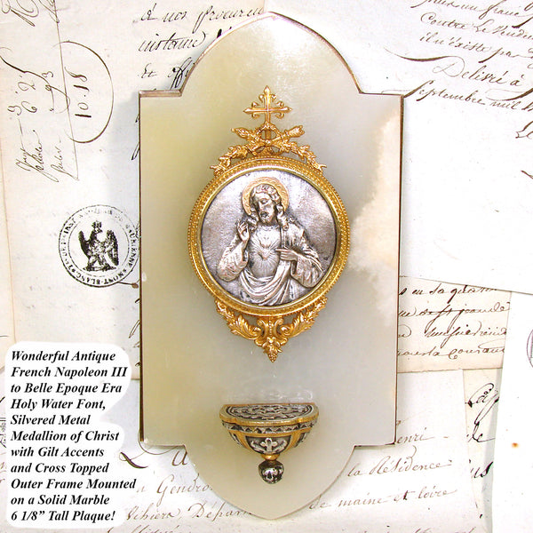 Wonderful antique French Napoleon III to Belle Epoque era Holy water with a silvered metal medallion of Christ in cross, torch & quiver finial gilded frame and lidded font mounted on a white marble & bronze backing!  The bas relief plaque or medallion has a silver or nickel plated finish with gilt or gold halo and depicts Christ and the Sacre Coeur or Sacred Heart of Jesus.  The Sacred Heart is often depicted in Christian art as a flaming heart shining with divine light, pierced by the lance-wound, encircled by the crown of thorns, surmounted by a cross, and bleeding. Sometimes, the image is shown shining within the bosom of Christ with his wounded hands pointing at the heart. The wounds and crown of thorns allude to the manner of Christ's passion, while the flames represent a furnace of ardent love.  Framed in a round gilded bronze framing with bow & ribbon and laurel garland accenting the top and bottom.  The plaque and font mounted to a white marble panel with brass backing.  A beautiful piece for sure!