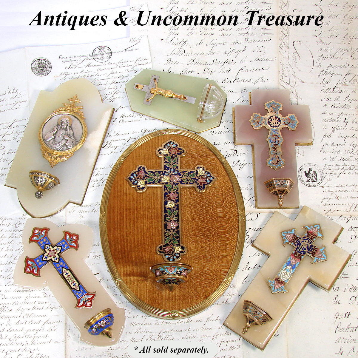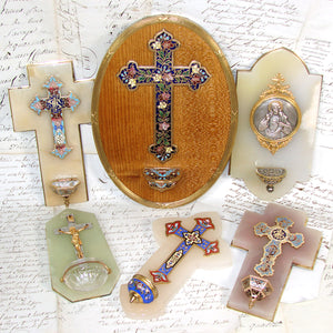 Both a religious devotional item and a work of fine decorative art, characteristic of the ornate craftsmanship popular during the French Second Empire under Napoleon III. It would likely have been used in a private chapel or home.  During the 18th and 19th centuries, especially in devout Catholic households in France, it was common to have a domestic holy water font mounted near a bedroom door or in a hallway.  Family members would bless themselves before prayers, before bed, or when leaving the house, invoking divine protection and sanctity within the home.  A wonderful decorative and/or devotional piece and one of a few that we currently have available.  Browse & enjoy!