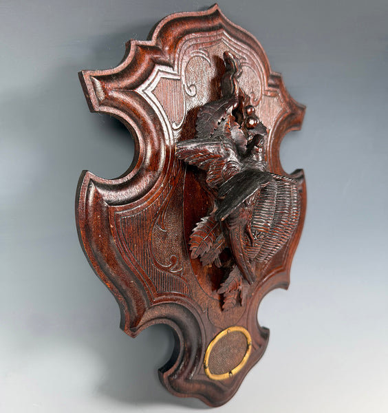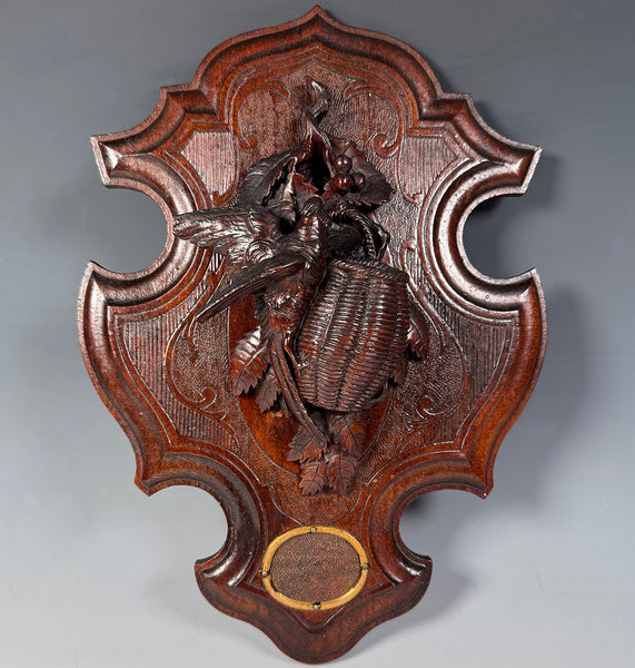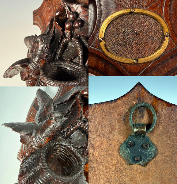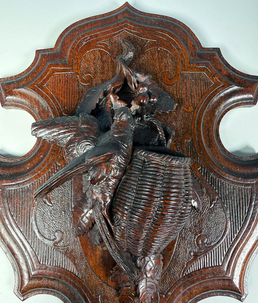 An exceptionally fine hand carved wood sculpture from the Anomalies movement, mid- late 1800s, the delicacy of the anatomical details on this bird and basket match holder is thrilling. On a fine and ornately trimmed plaque approximately 1/2" in depth, the piece is substantial for its kind at 11" tall, 7.75" widest and 2.5" at deepest. A full relief carving rather than usual bas relief, and in great condition.