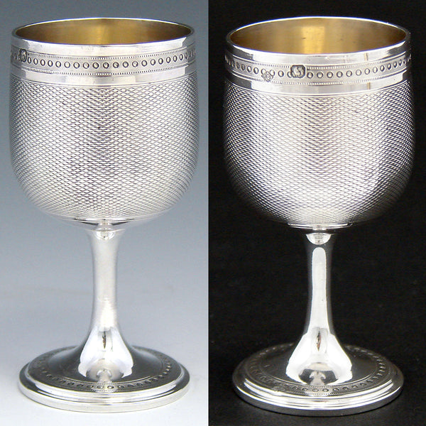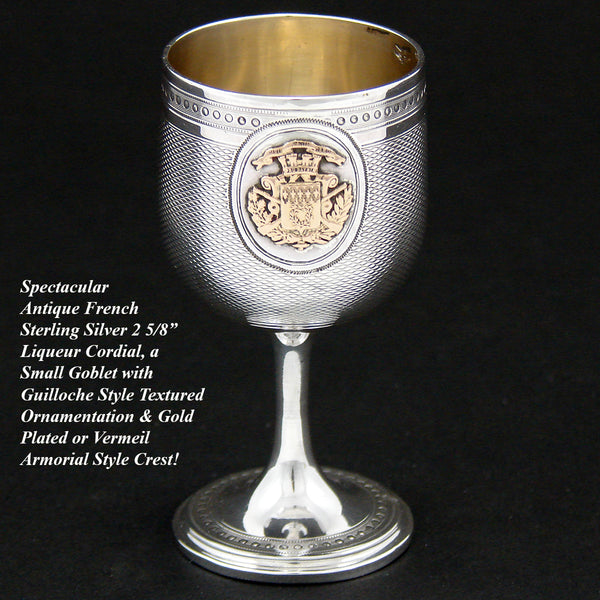 Spectacular antique French Victorian or Napoleon III era sterling silver 2 5/8" tall liqueur cordial, a lovely small goblet with guilloche style textured ornamentation & 18k gold plated "vermeil" armorial style crest!  The perfect way to limit your intake with exceptional style :).  I haven't measured but I'm pretty sure it holds around one ounce so basically shot sized.  Thick & heavy for its size, beautiful in that unmistakable French style and the gold plated medallion is just icing on the cake.  I meant to get a closer shot of the inscription on the medallion but will look later and add the text you can see on the top banner.  A beautiful piece, don't miss it!