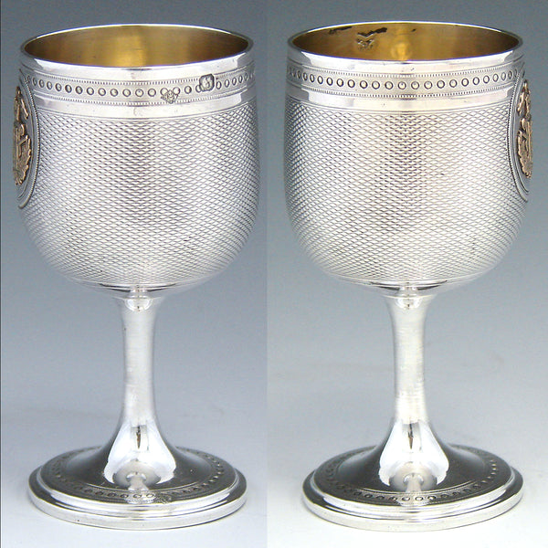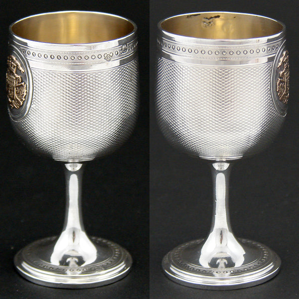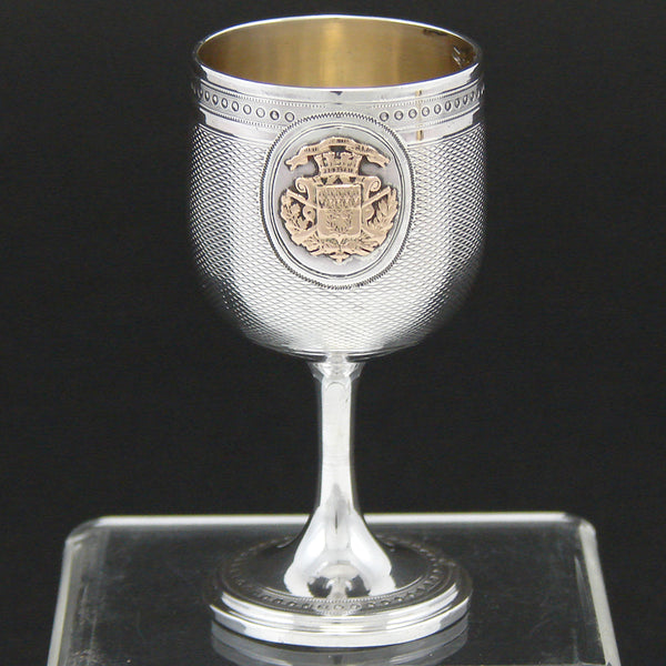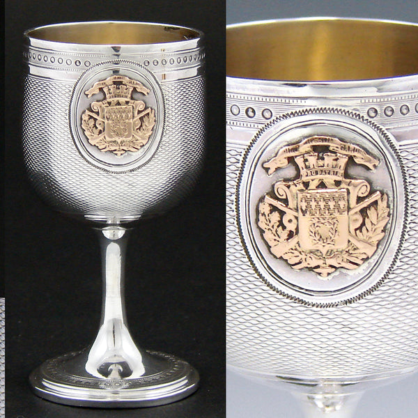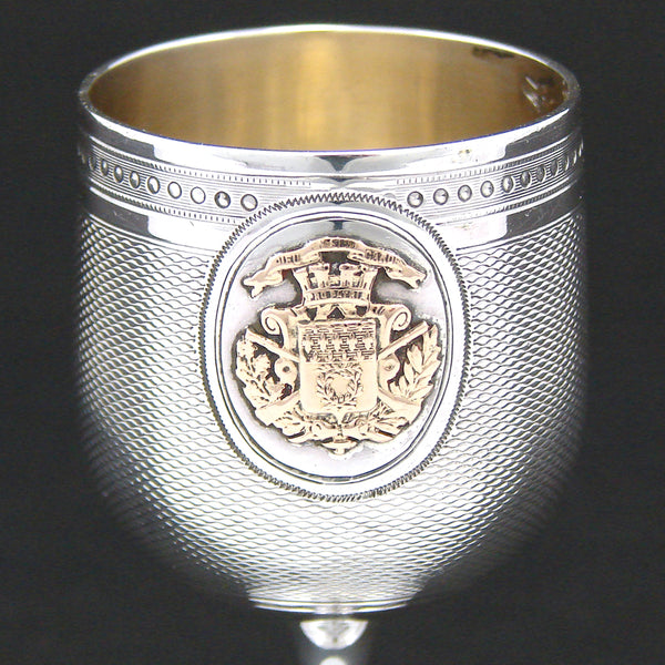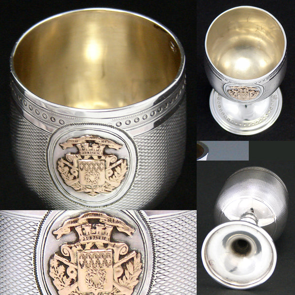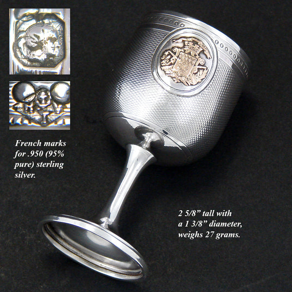 Antique French Sterling Silver 1oz Liqueur Cordial, Goblet with 18k Gold Vermeil Armorial Style Crest