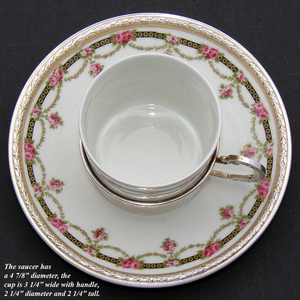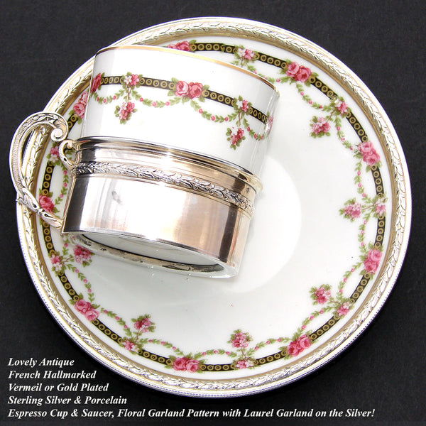 Antique French Vermeil on Sterling Silver & Porcelain Expresso Cup & Saucer Set, Floral Garland