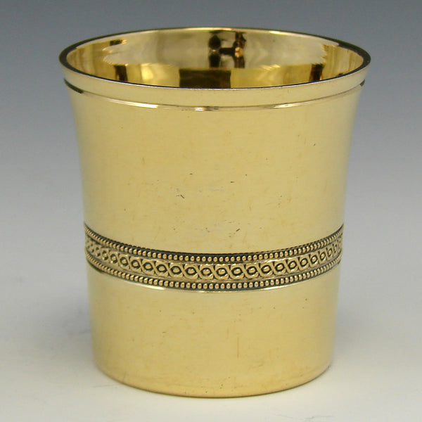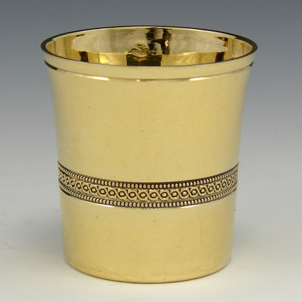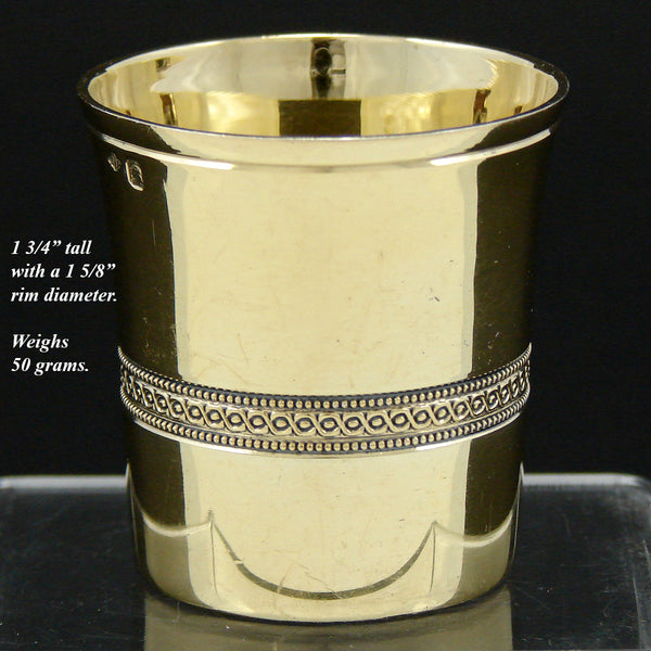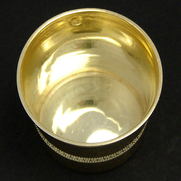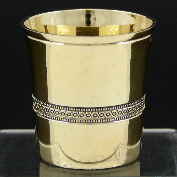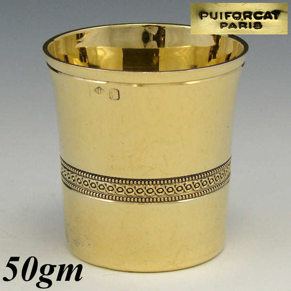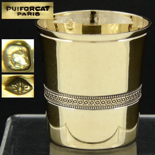 Elegant antique to vintage French Puiforcat hallmarked 18k gold on sterling silver "vermeil" shot glass or liqueur cordial. This substantial piece features a striking Celtic-inspired band and showcases the exceptional craftsmanship Puiforcat is renowned for. The thick, heavy construction and near pristine condition make it a distinguished addition to any collection of fine French metalwork. If you're going to imbibe, might as well do it in style, right? Also great as a desktop accent for paperclips, etc., toothpicks or match stick holder on the mantel, uses only limited by your imagination.