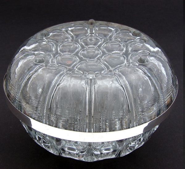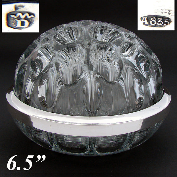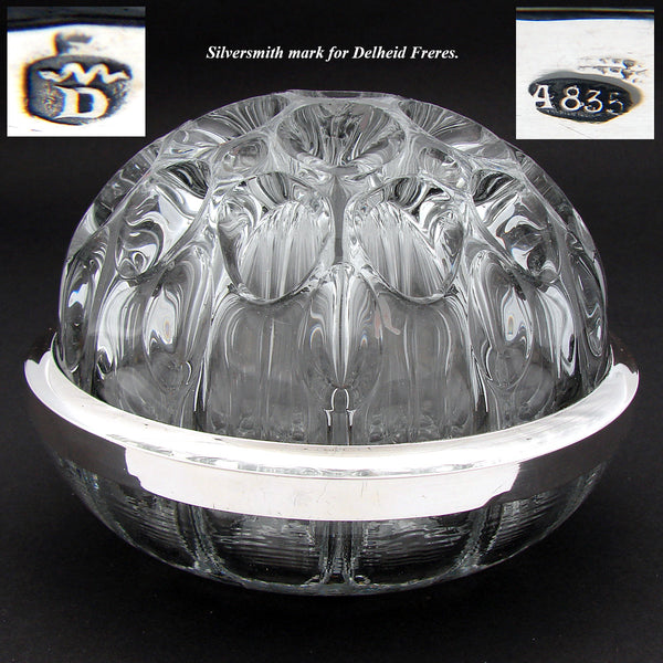 Gorgeous vintage Delheid Freres hallmarked .835 (nearly sterling) silver & blown glass 6.5" diameter round flower frog, vase or centerpiece, medium sized and relatively heavy at just under 3.5 lbs & definitely beautiful! We have a few of these and I'll be getting the others listed in the next week or so surely. Wonderful decorative accents, just add flowers and the display is superb! The silver band bears the maker hallmark for Delheid Freres of Brussels, Belgium and the piece dates to 1940s likely. The base of the glass insert is marked "Made in France" so a company in one country collaborated or ordered the complimenting part from the other. Lovely, don't miss it!