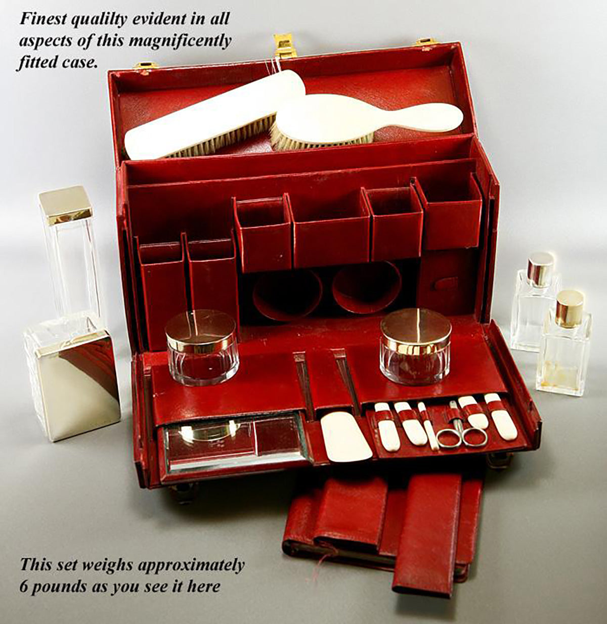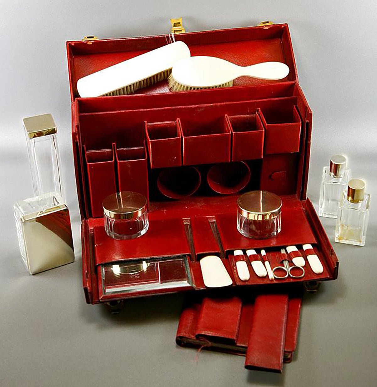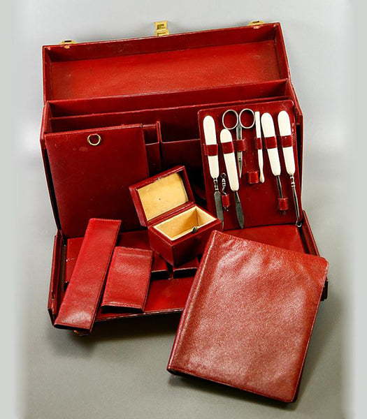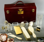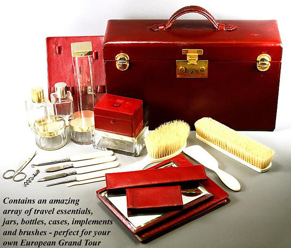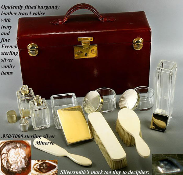 Oh, to travel as the French did - imagine a tres chic Mme. boarding the train with her ermine stole slipping off one shoulder, this case firmly grasped in hand and the other slender-fingered hand curling into the collar of the lover she's kissing good-bye. Yes, I have little movies in my head for many of our beautiful things, but perhaps these antique travel cases hold the most romantic of visions for me. They speak of destinations, get-aways, romantic interludes, glamour and opulence as no other items seem to. I suppose that is why I find them so appealing. This one is simply stunning! Both as a closed case, slender and rich crimson leather trimmed out in brilliantly shined brass - and as a rich repository of layer upon layer of jig-saw puzzle fittings inside that explode with panache. First standard French Minerve marks the caps as finest quality French sterling silver, and the creamy pale ivory used in these brushes and implement handles is of finest quality, as well. Yes, mid to late 1800s Dieppe imported ivory tusks from the far east (elephant) and imported legally in their time as in our own, the set is richly appointed, professionally sanitized and ready for you to use for your own Grand Tour or romantic getaway. None finer!