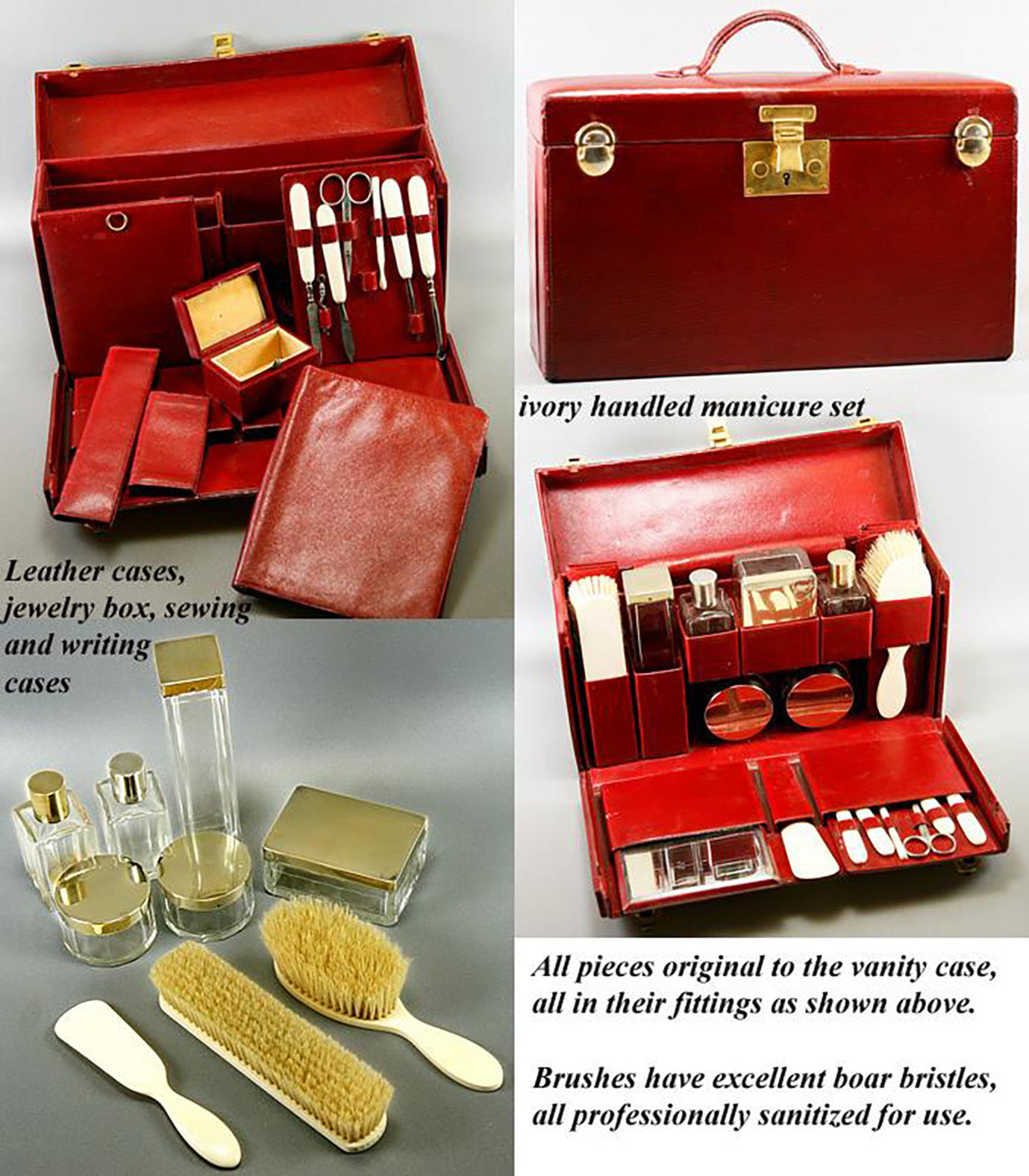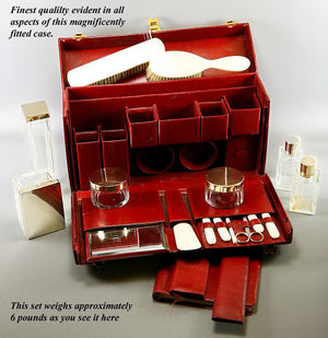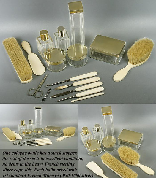Very good to excellent condition, age and type considered. There are no dents or damage to the sterling silver and no breaks to the jars or bottles though one has a stuck stopper that has sheared at the neck and will require a pro to remove it. The case is superb, handle strong and supple, still. I find it impossible to read the silversmith's mark on this set, but I did buy it along with Hermes and Cartier pieces/sets and it came from a very elegant Paris estate. I would not be surprised to find that it is also Hermes, though I see no signatures and cannot read this minuscule poincon (diamond shaped losenge impressed in each sterling silver piece, notes the silversmith). Unable to confirm my suspicion, I will price it as though it is not Hermes, but rather think it is. Experts out there, can you help us? Brushes have been sanitized, show little or no use and no losses. Ivory handles on implements are free of cracks, are of finest quality, smooth and sensual to the touch. The case itself measures 12 7/8” x 4 1/8” and is 7 7/8” to 9 7/8” tall (without and with handle). The brushes are 6 5/8” long, perfumes are 3.5” tall, round jars have 2 1/4” diameters, rectangular jar is 3.5” x 2.5” and the toothbrush jar is 6.5” tall. A superb set - enjoy!