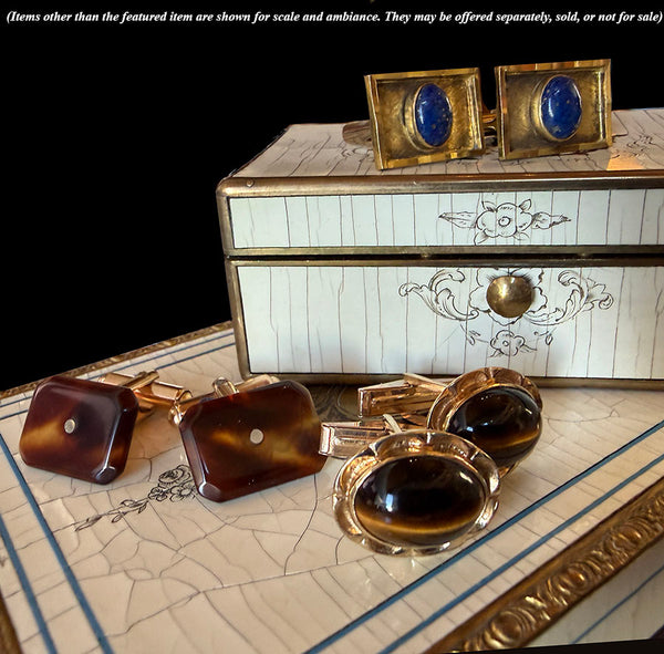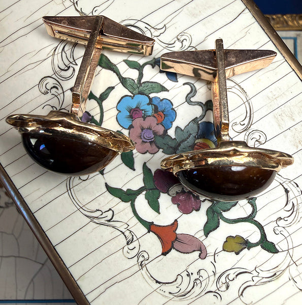 Vintage 1980s 14k gold cufflinks pair, tiger's eye cabochons. Total weight: 9.06 grams, estimate 7+ grams for the gold (1.11.2026 gold value over $600). Offering below gold melt value.