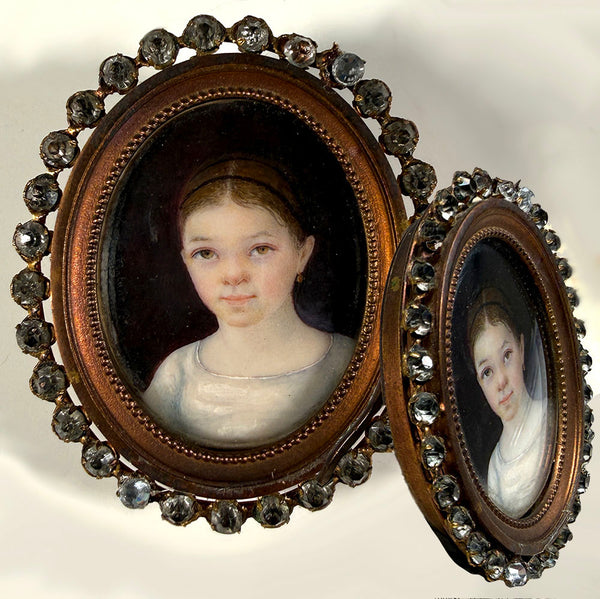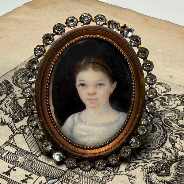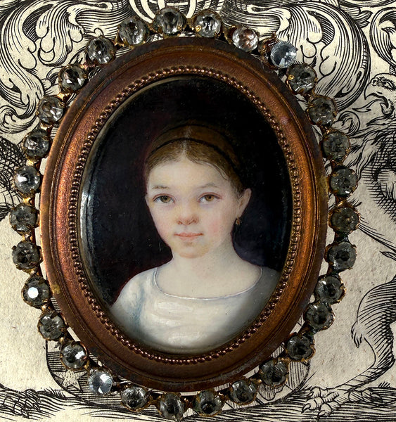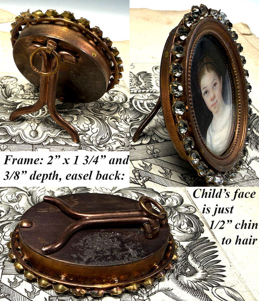 Charming c.1840s Portrait Miniature of a Child, Young Girl in French Paste Gem Set Easel Frame