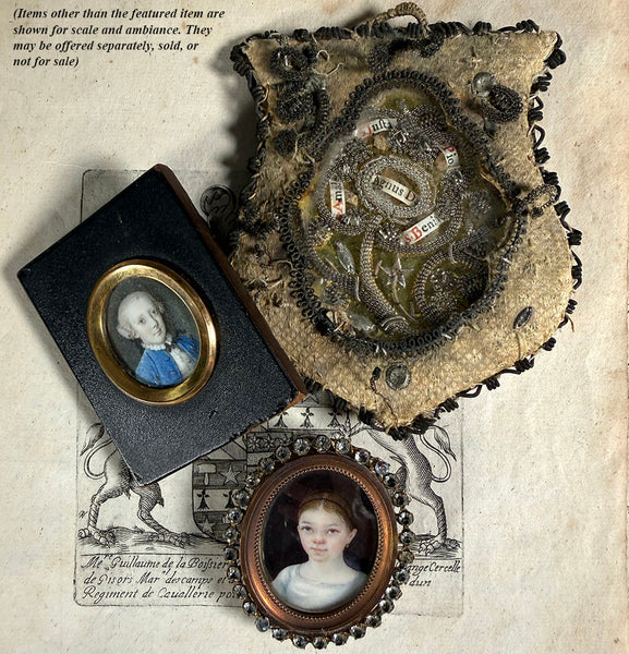 Sweet innocence in the beautiful wide-set eyes, slight down-tilt of her head, this girl (center hair part = girl) must be 4-6 years of age. The gouache painting on wafer is an original work of art, perfectly preserved under glass in its original metal frame with a copper-looking patina of age. The surrounding and complete halo of French paste gems are crisply cut and brilliant, very nice. Tiny 'palm of the hand' treasure, she dates to Charles X era, c. 1820s-30s. Full measurements noted on the photos.