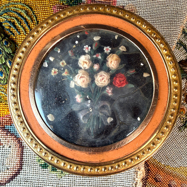 Very good to excellent condition for age and type. If someone had a gold bottom ring created for it, it would be near perfect. No damage to the shell interior lining, which is what, along with the size, indicates it began life as a snuff box. Must have been a special gift, indeed. The Vernis Martin work is superb, evenly retains its color and finish of layered paint and varnish. A few flakes of the wax misplaced within, but virtually all of the flowers still have crisp hand pressed petals. Lovely old thing - a true museum piece!