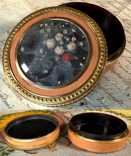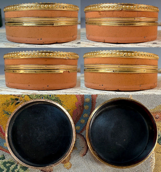 Rare 250 + year old treasure - bands of 18k gold against a pale salmon pink Vernis Martin snuff or patch or bonbon box (missing a 5th band lost from the bottom), this is a precious work of art. Unique, the miniature floral bouquet within is crafted of wax, including the etherial stems and blow. Preserved beneath the high bombe cover glass, one has to look at it for a moment to see that the pale swirls are part of the ribbon. Lots of gold on this one, acid-tested 18k, I do not have a weight since the bands are pin/nailed on and it would damage the piece to try to weigh just the gold. Full measurements are noted on the photos.
