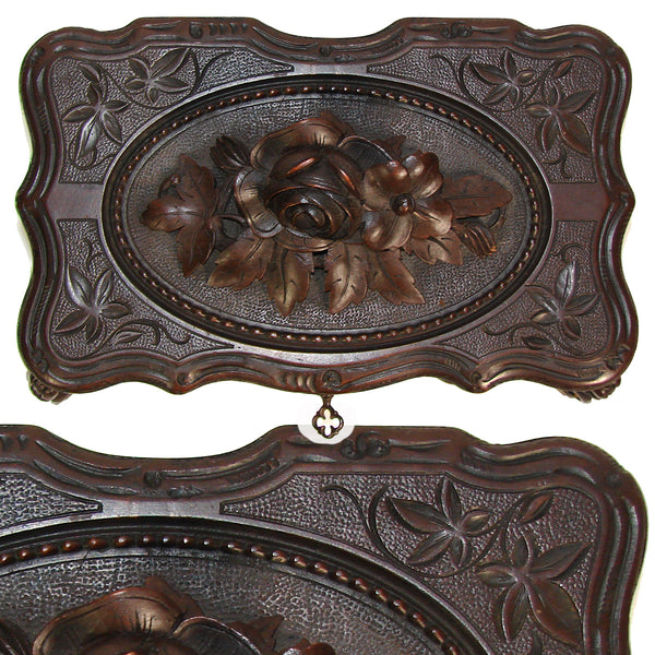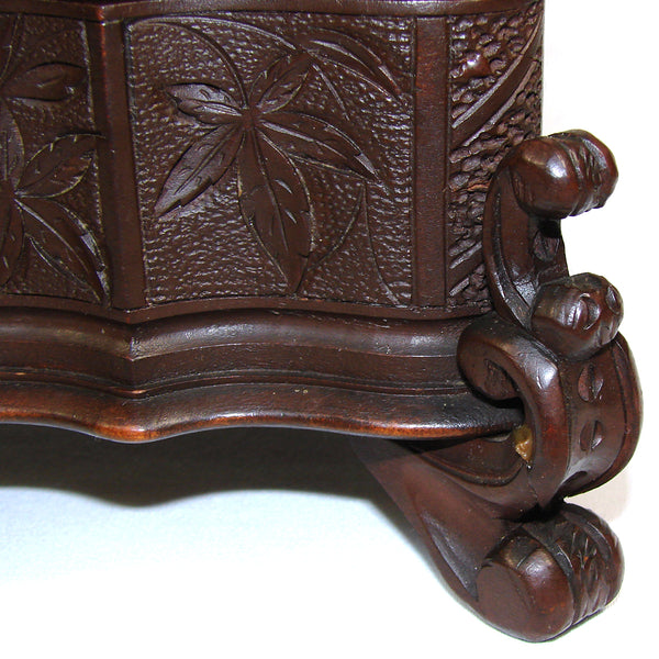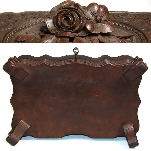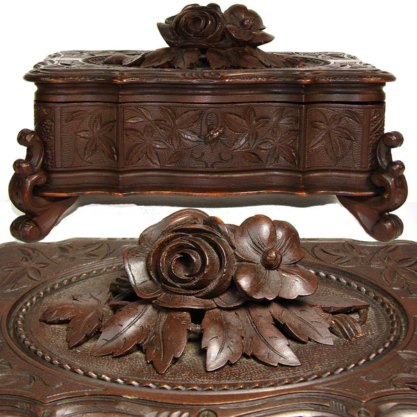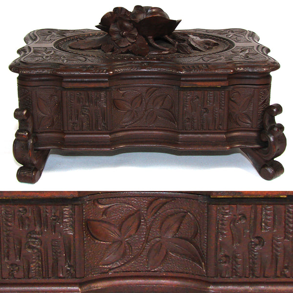 Antique Victorian Era Black Forest Carved 9.5" Jewelry Box, Serpentine Shape with Flowers