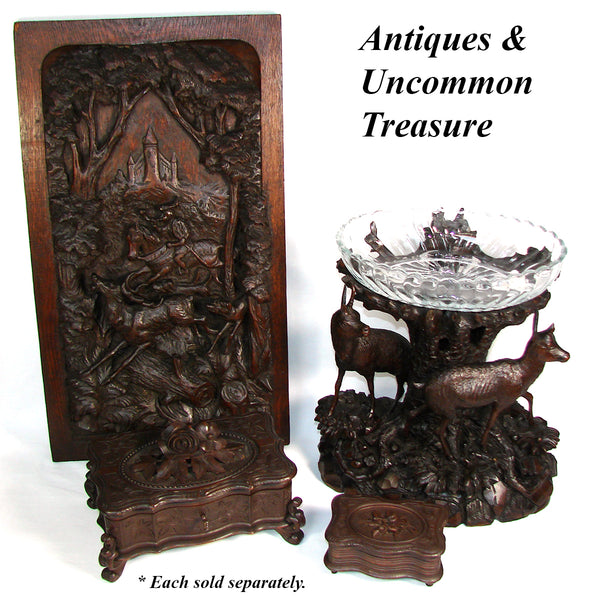 “Black Forest” refers to the Schwarzwald region of southern Germany, which became famous in the 19th century for highly skilled woodcarving, cottage-industry production (family workshops and export luxury goods for Britain, France, and the U.S.  By the Victorian period, Black Forest carving had become extremely fashionable, especially among the middle and upper classes.  A lovely larger chest here!