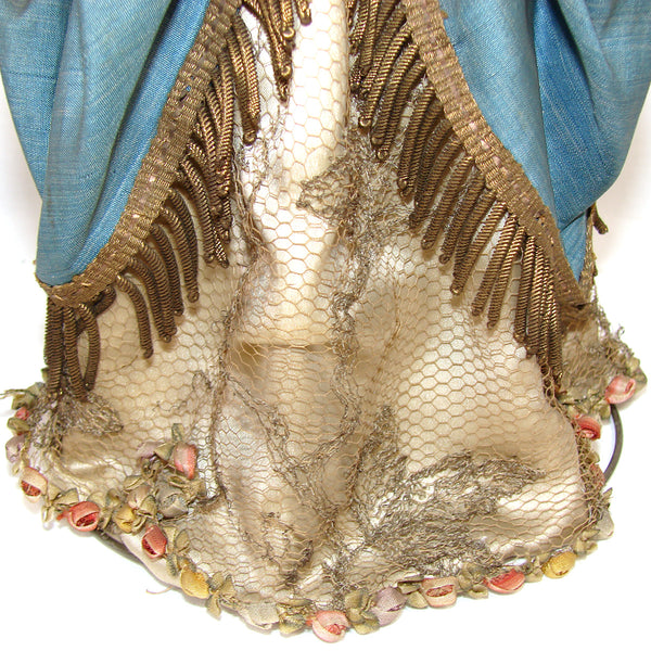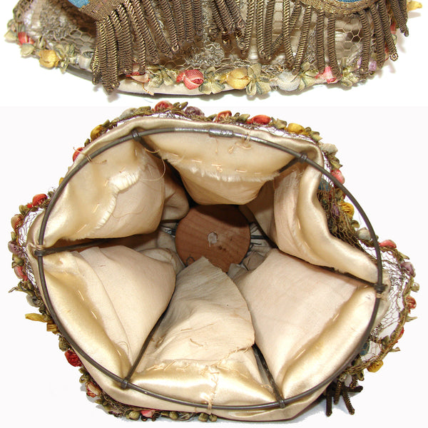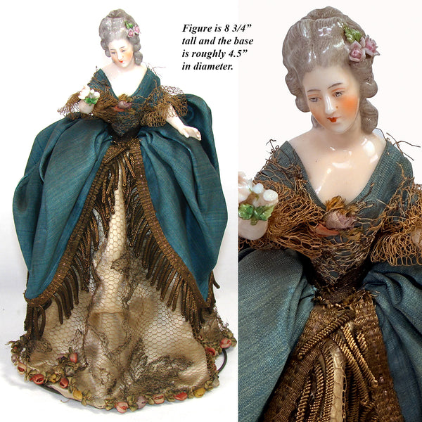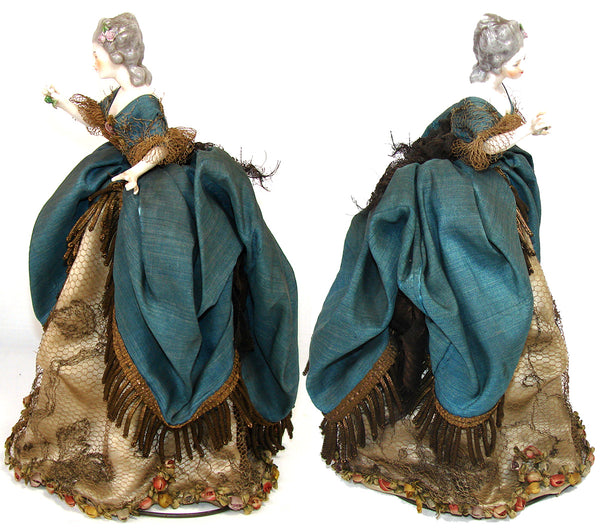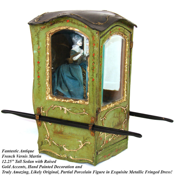 Rare antique early 1800s French Vernis Martin style oversized 12" tall "miniature" sedan with hand painted & raised gold decoration, original thick beveled glass windows AND what is likely the original 18th century style partial porcelain doll or figure inside, an amazing work with hand painted porcelain bust, head & arms and truly exquisite gold metallic fringed dress!  Somewhat of a contradiction to say "large or oversized miniature" but that describes the piece in the context of other sedans we've offered in the past.  Leaving the sedan aside, the figure or doll within is another work of exceptional art.  I've included several large photos showing the expert detail, magnificent craftsmanship and superb condition that we find it in today.  Truly breathtaking!  The figure and sedan together, simply wonderful!  A miniature version of the extravagance some were afforded and this will definitely be one for the Vernis Martin and/or doll collectors, don't miss it!