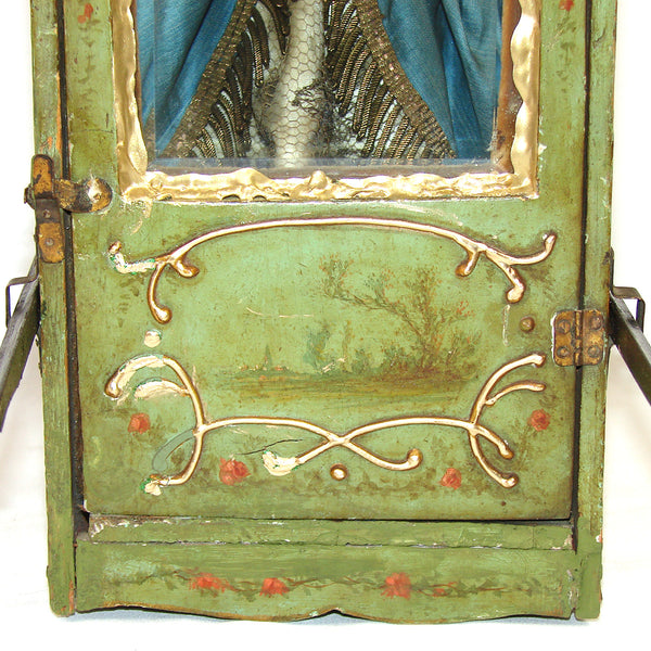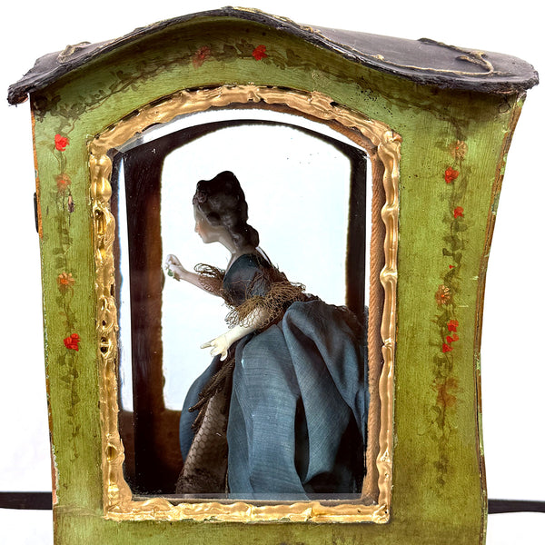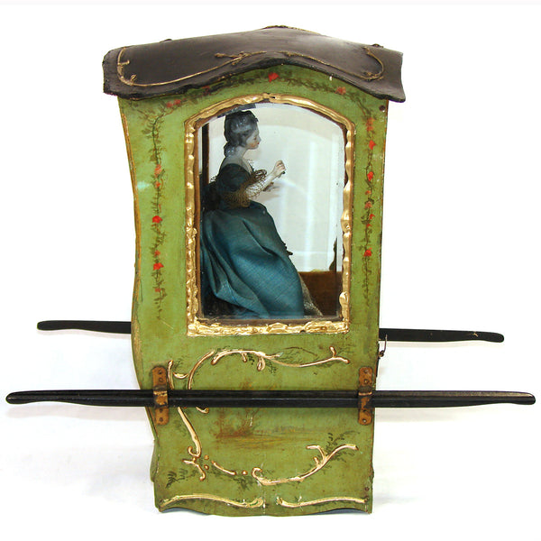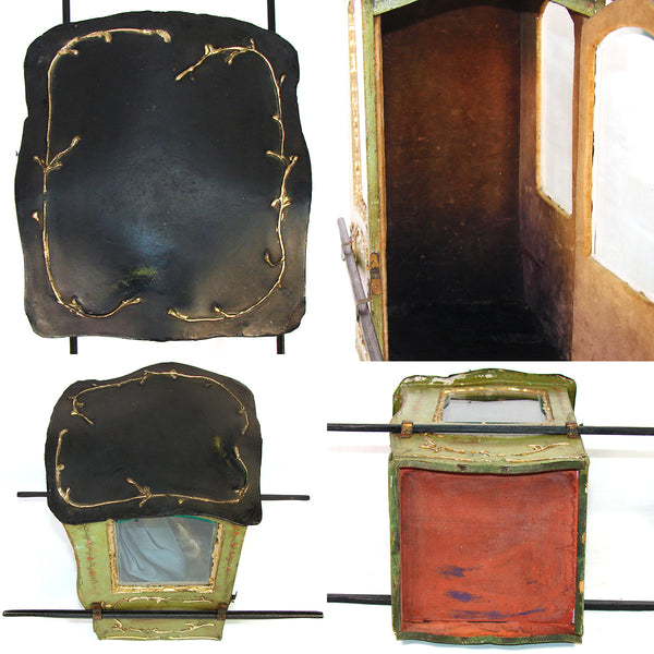 Very good condition, age considered.  The sedan/box itself has some repairs.  The gold trim around the original beveled glass windows is one spot of restoration, there has also been some gold enamel touch-ups to the raised decoration on sides and lid.  The door latch works fine and is original, as are the side rail or pole fixtures though the poles or shafts themselves are later restorations.  There would have been protruding feet on the base, extending out a bit front and back on each side but they've been broken off over the years.  A bit of touch-up to the green paint in areas but well matched in color.  The doll or figure within is near pristine with just a bit of age soiling to the dress in spots, a few tears to the mesh and, I believe, one broken figure.  Just as you see both the box and figure, the images show all so peruse all and you're sure to be impressed (even with the flaws).  See pictures for all measurements.