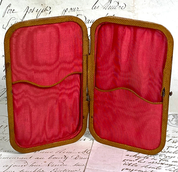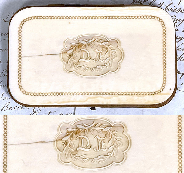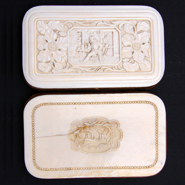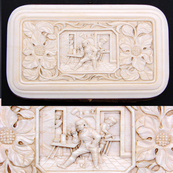 Fabulous antique Victorian era hand carved genuine ivory cigar, cheroot or eyeglasses case, an exquisitely detailed figural facade with pipe smoking man & floral decoration and a carved rear with "DF"(?) monogramed medallion!  With a nod to the small age/drying crack on the monogrammed side, this piece is nearly pristine.  Original leather baffles and red moire silk lined interior are all remarkable given it's age and the materials.