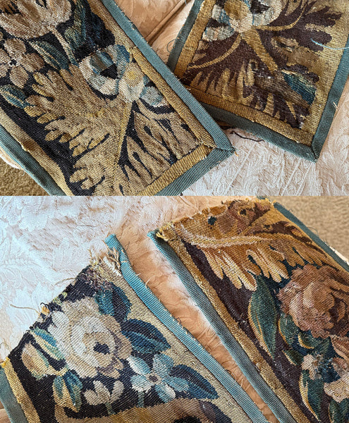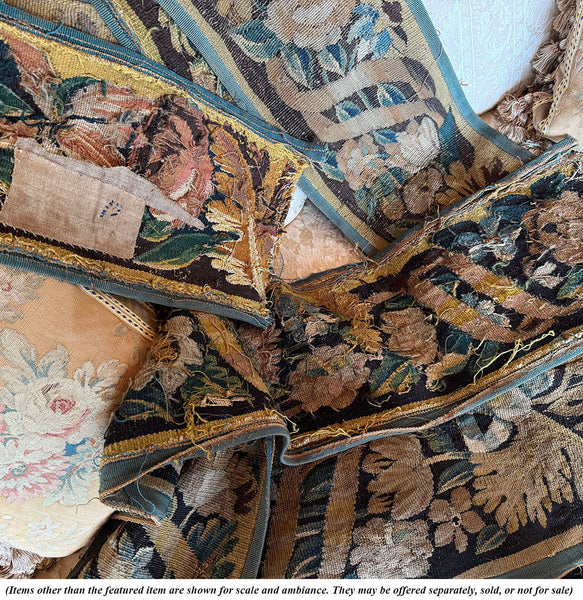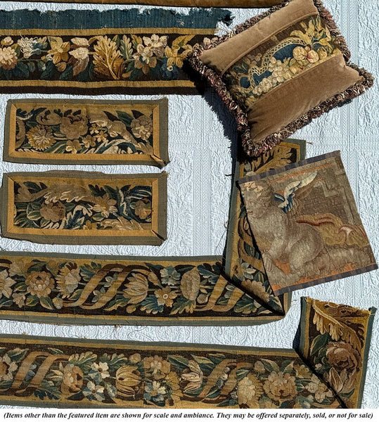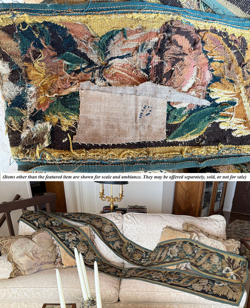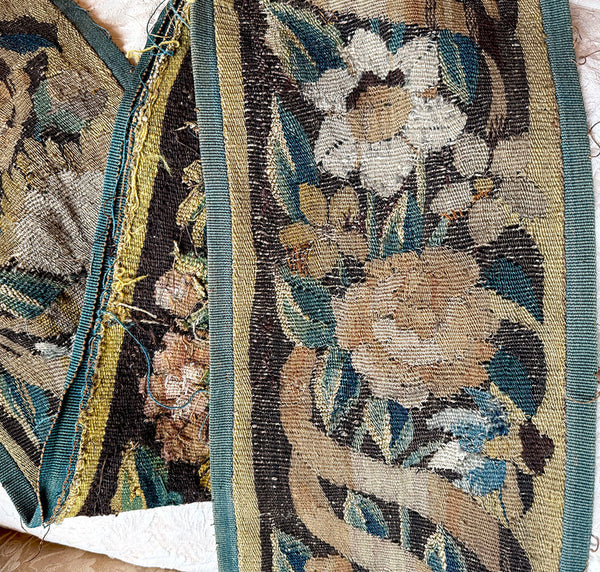 The outer border panels salvaged from a large 17th century hand woven French or Flemish verdure tapestry, these await the decorator in you! A full 7.6 foot long pair, you can flank a doorway, framed or simply backed and hung. You could sew them together and create a king bed wall hanging or headboard on the horizontal, with some left over to make up pillows to match. RARE to find pairs like this, and I found them in Paris some time ago, but only 'refound' them at the warehouse recently. Really nice tapestry, they've been worked over and also have an edging in teal blue-green which gives you a little more to work with. Super long and narrow panels are hard to show in photos. You'll have to use your imagination a little. The final couple of photos show these (folded in part) along with other border panels I'll be listing soon.