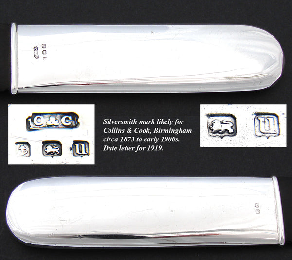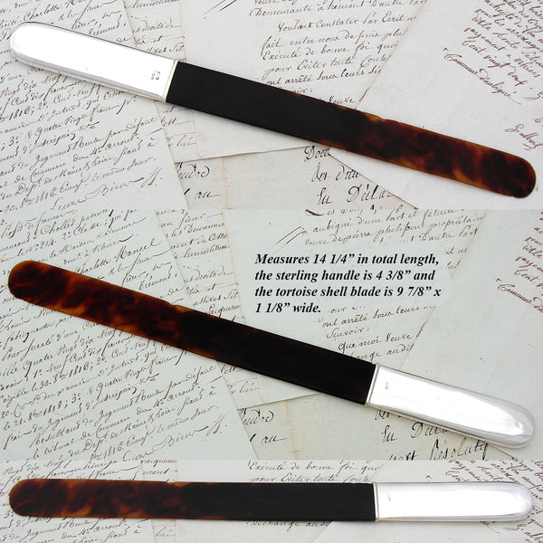 Elegant antique English Edwardian era hallmarked sterling silver & genuine tortoise shell 14.25" letter opener, actually a document or text "page turner" with mirror smooth handle & long genuine shell blade!  The handle bears English sterling silver hallmarks, the Birmingham date letter is for 1919 and the silversmith is most likely for Collins & Cook, circa 1873 to early 1900s.  The inscription reads 29th July 1903 so was made prior to the dedication.