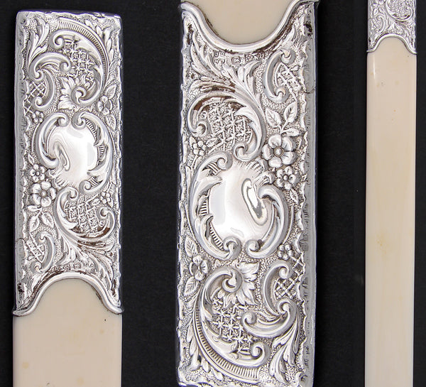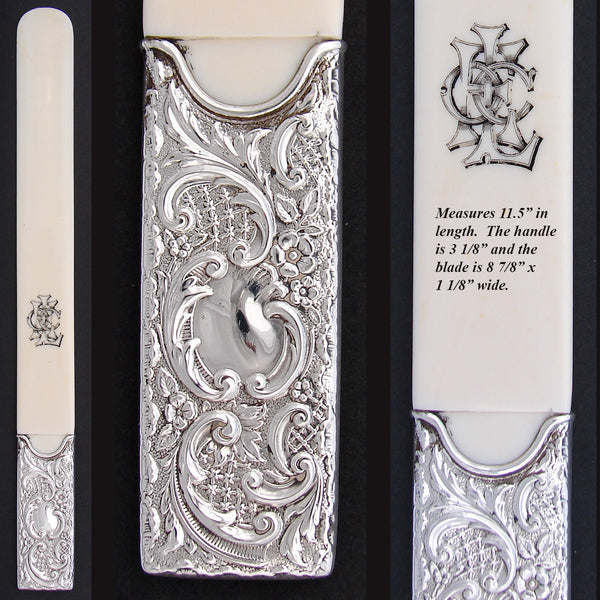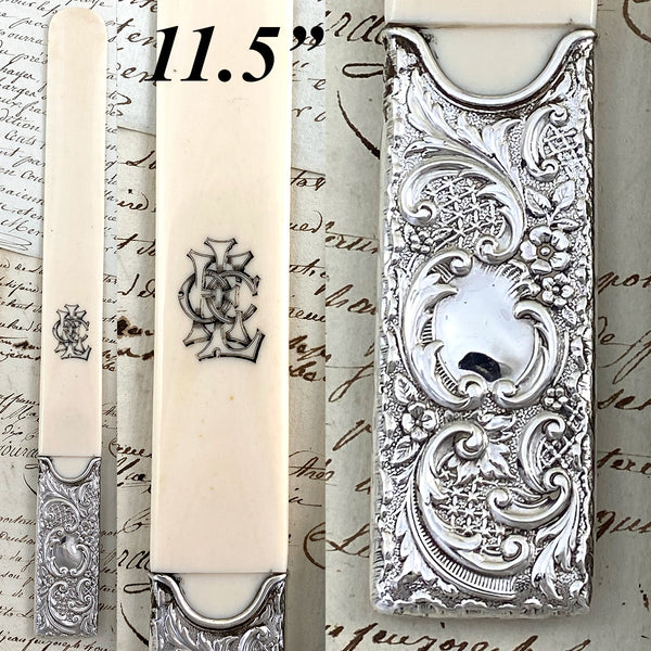 Superb antique English hallmarked sterling silver & genuine ivory 10.5" letter opener, actually a document or text "page turner" with highly ornate rococo patterned bas relief handle and fantastic incised & lac filled interlaced monogram on the blade!  The handle bears English sterling silver hallmarks, the London date letter looks like it's for 1910 and the silversmith mark is for John & William Deakin.  One of several of these large document or text page turners, mostly sterling silver with either tortoise shell or ivory blades, so I thought I'd add a little bit of history on and the actual purpose of them.