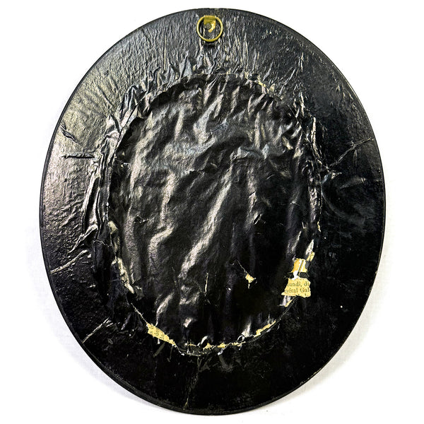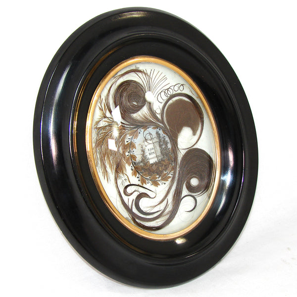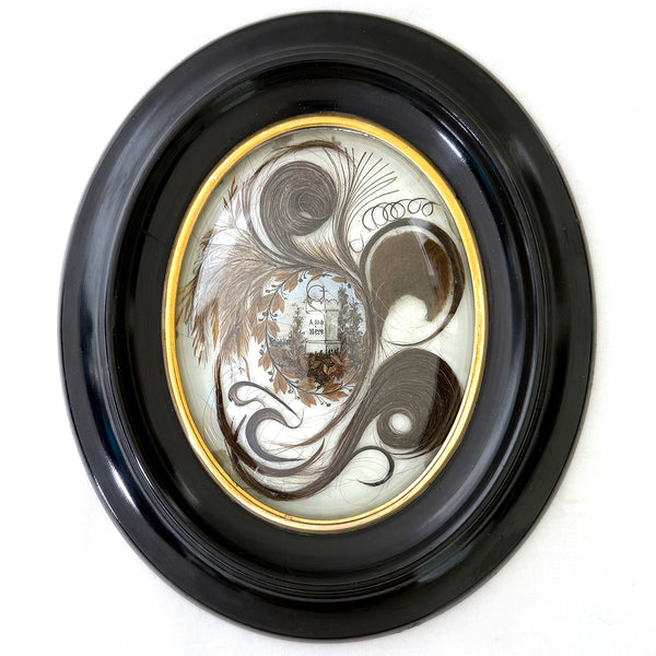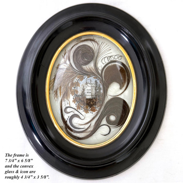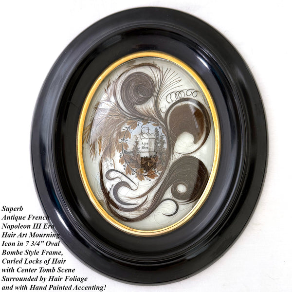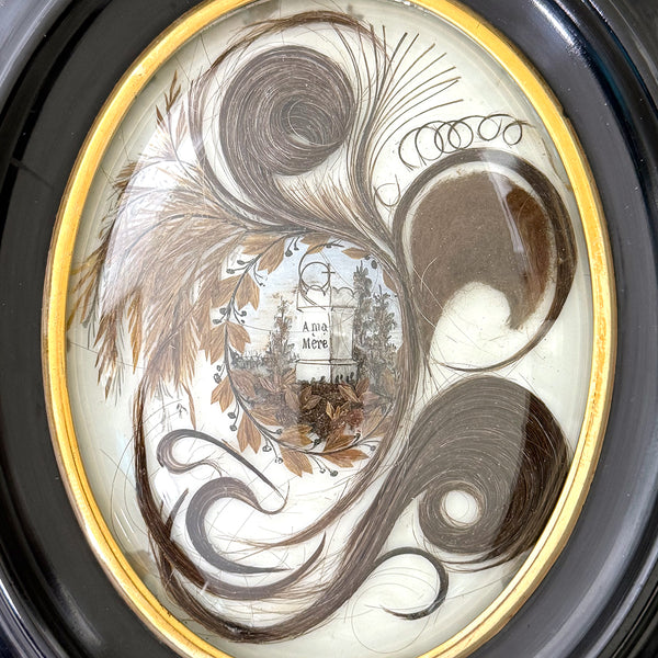 Lovely antique French Napoleon III era hair art mourning icon or Memento, displayed in an oval ebonized wood bombe style frame and featuring curled locks of hair and tomb with “A Ma Mere” inscrition, hair foliage surroundings and hand painted accents!