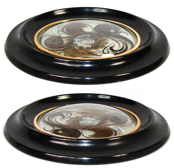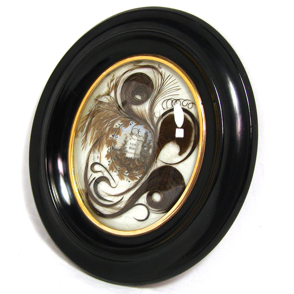 Hair mourning art was heavily influenced by the romanticism of the period, which often idealized death as part of the cycle of life. These items were often used to mourn loved ones, but the emotional weight was also tied to Victorian ideals of memory, loss, and eternal love. Hairwork was not just about loss; it also signified continuity—a way to keep the departed “alive” through a tangible, personal connection. The curled locks of hair at the heart of the work are indicative of the intricate hairwork technique, where strands were carefully woven or coiled into decorative shapes. This practice was common in the mourning period, symbolizing not only the person’s death but also their ongoing presence in memory.