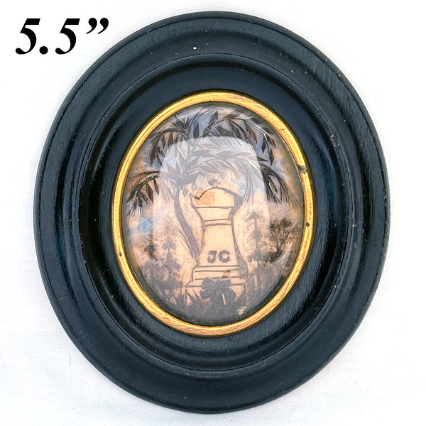 Rare antique French Napoleon III era hair art mourning icon or memento, displayed in an oval ebonized wood bombe style frame and featuring curled locks of hair and tomb with “JC” inscrition, hair foliage surroundings and hand painted accents!