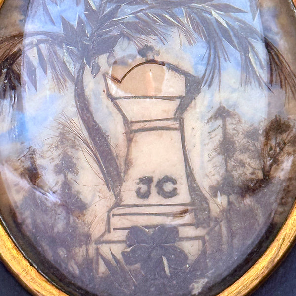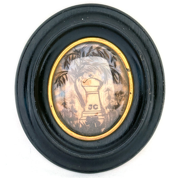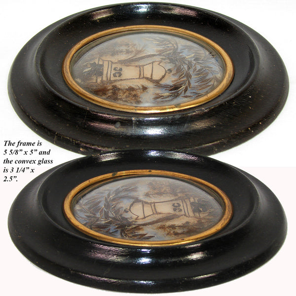 Antique French Mourning Hair Art Memento, Tomb Scene in Oval Ebonized Bombe Style Frame