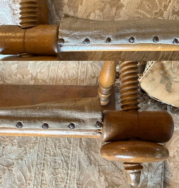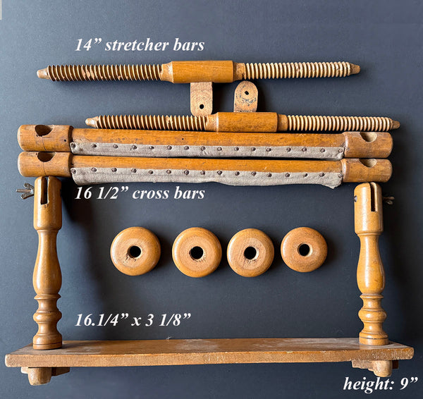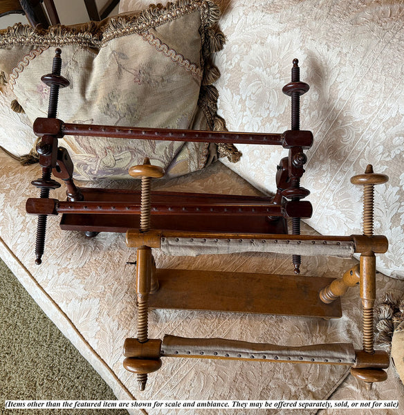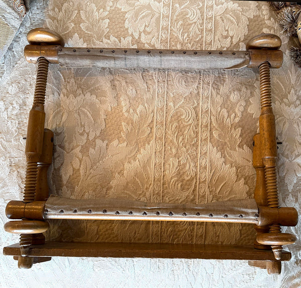 A Country French piece of antique furniture, a lady's sewing tool for needlework or embroidery, or quilting, this is the size made for tabletop or laptop use, a stretcher to hold the fabric or canvas tight so needlework can be worked beautifully. Entirely made of wood, this one has only 2 small metal bolts with butterfly wing nuts to tighten the angle of the frame. It comes apart into small space for storage or for shipment, and assembles quickly when one wishes to put it to use. A simple natural finish and wood, it's pretty when out and in use, as well - like fine furniture. Complete, no flaws to note, no breaks. Elegance of age to the wood. Full measurements noted on the photos.